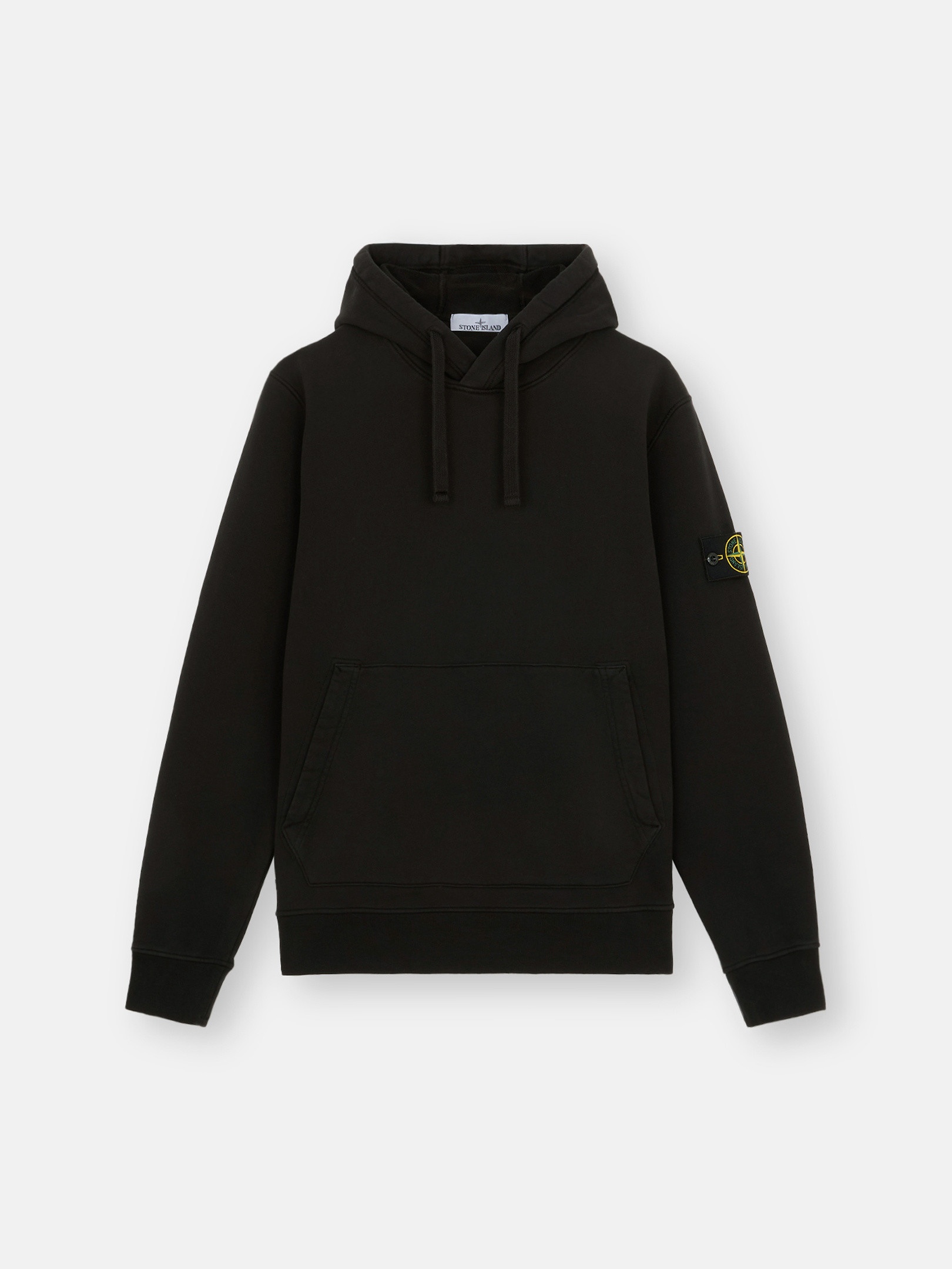Sweatshirt in cotton fleece featuring hood with contour drawstring, pouch pocket, a lined lunette under the back neckline, and overlock seams. Garment dyed. FABRIC RESEARCH AND TREATMENT Hooded sweatshirt in cotton fleece. Garment dyed. STYLE AND FIT Hood with contour drawstring. Pouch pocket with slanting entrances. Stone Island badge on the left sleeve. Lunette with inner lining on back, under the neckline. Overlock seams. Ribbed cuffs and bottom band. Regular fit. COMPOSITION AND CARE 100% Cotton