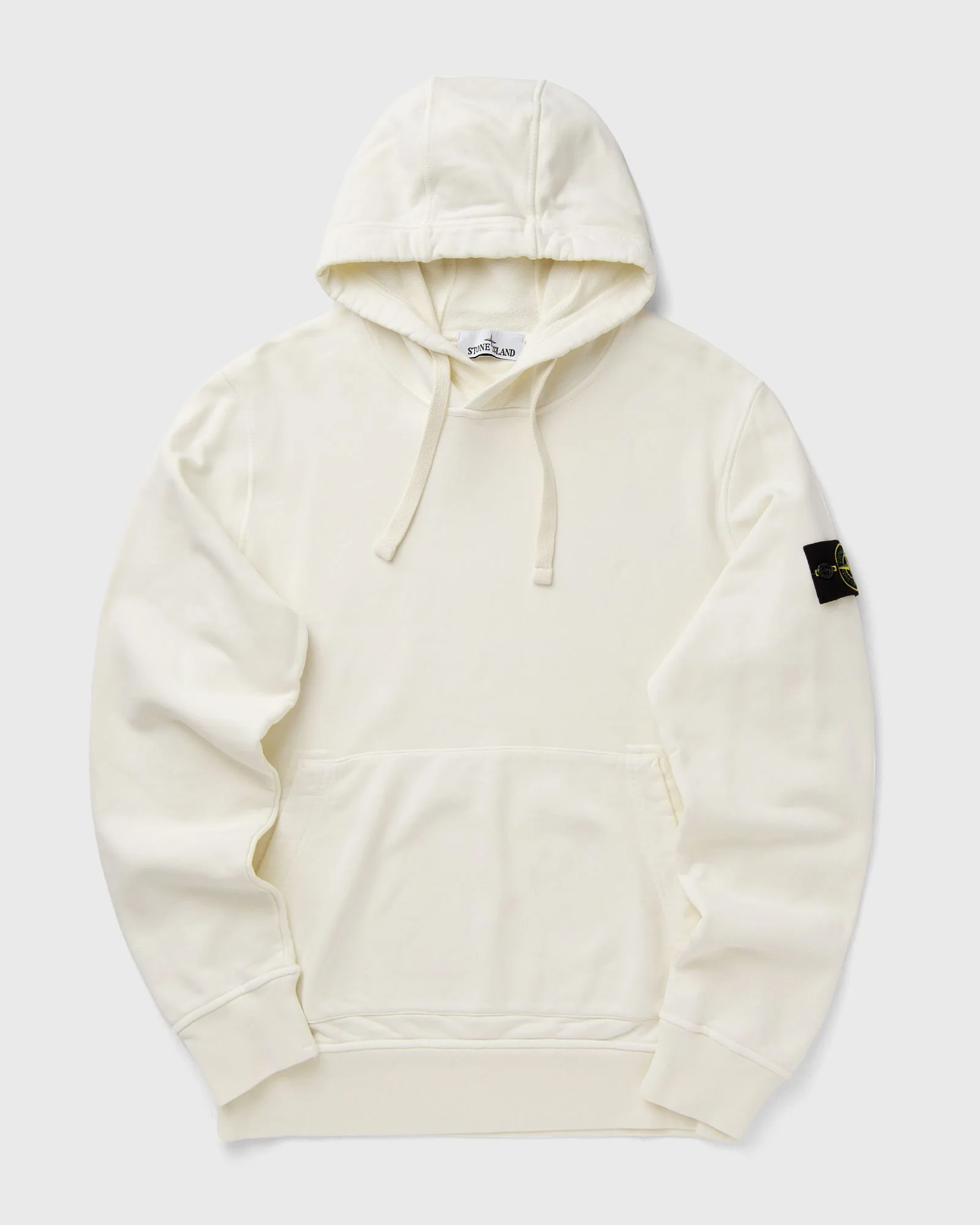 The Stone Island hoodie is made from organic cotton fleece and impresses with its medium weight for optimal comfort. The hood and pouch pocket give it a casual style, while raglan sleeves at the back, overlock seams, and ribbed cuffs and hem underline the high-quality workmanship. Each piece is piece-dyed, giving it its own individual color intensity. - Hood with drawstring - Pouch pocket with slanted opening and reinforced tape inside - Semicircular yoke under the back neckline with reinforcement inside - Raglan sleeves at the back - Stone Island badge on the left sleeve - Ribbed cuffs and hem - Overlock stitching at the seams - Regular fit Article number: L1S156100062S0051.V0093 Gender: men Color: IVORY Material: 100% Cotton