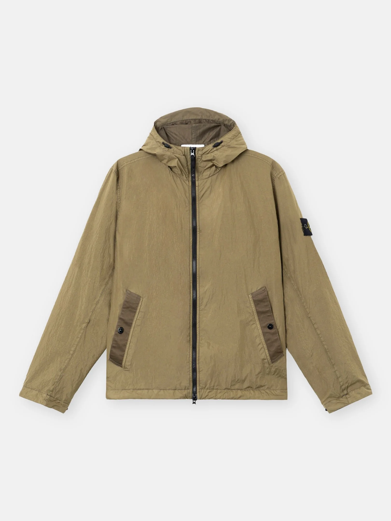 Hooded jacket in light recycled nylon rep with a crinkled appearance, featuring snap-fastened pockets, adjustable snap cuffs, and a two-way zipper. Garment dyed with anti-drop. FABRIC RESEARCH AND TREATMENT Hooded jacket in a light recycled nylon rep with an ultra-tight weaving construction. The resin coating of its inner face makes it wind resistant and mildly water resistant. Due to the resin treating of the material, the color penetrates unevenly into the material, lending a crinkled appearance to the surface. Garment dyed with the addition of a special anti-drop agent. STYLE AND FIT Hood with shaped visor and fixed elasticated drawcord with stoppers. Angled welt hand pockets with tape trim and snap. Stone Island badge on left sleeve. Adjustable cuffs with snap. Elasticated drawcord at bottom hem. Two-way zipper fastening with internal nylon tape placket. COMPOSITION AND CARE External Fabric: 100% Polyamide / Nylon Coating: 100% Polyurethanic Resin Lining: 100% Polyamide / Nylon Hood Lining: 100% Polyamide / Nylon