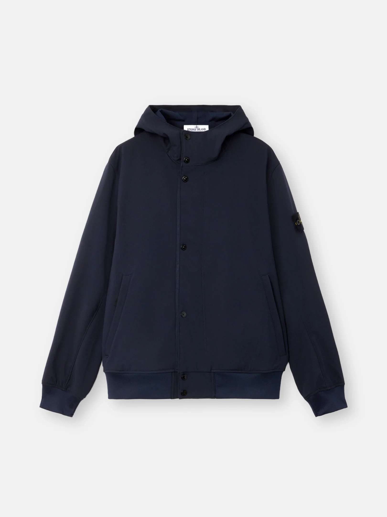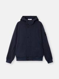 Hooded jacket in a three-ply performance material with 8000 MM water column, featuring zipper pockets, ribbed trims, and a two-way zipper. FABRIC RESEARCH AND TREATMENT Hooded jacket in a three-ply performance material with an 8000 MM water column. The polyester stretch canvas outer face is woven with yarns using the e.dye® Waterless Color System™ technology, the innovative yarn color saturation system. The fabric is laminated to a breathable, water- and wind-resistant inner membrane, protected by a textured polyester jersey backing layer. The outer structure of the material gives great flexibility and comfort to the garment. STYLE AND FIT Hood with internal drawstring. Angled hand pockets with concealed zipper. Stone Island badge on left sleeve. Ribbed cuffs and bottom band. Back yoke. Two-way zipper fastening on tape under snap placket. COMPOSITION AND CARE Garment: Outer Layer: 92% Polyester 8% Elastane / Spandex Membrane: 100% Polyurethanic Resin Inner Layer: 100% Polyester Ribbing: 98% Polyester 2% Elastane / Spandex