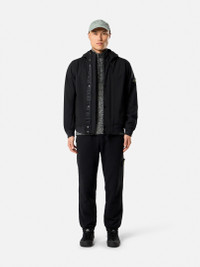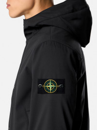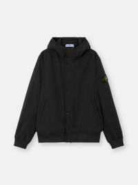 Hooded jacket in a three-ply performance material with 8000 MM water column, featuring zipper pockets, ribbed trims, and a two-way zipper. FABRIC RESEARCH AND TREATMENT Hooded jacket in a three-ply performance material with an 8000 MM water column. The polyester stretch canvas outer face is woven with yarns using the e.dye® Waterless Color System™ technology, the innovative yarn color saturation system. The fabric is laminated to a breathable, water- and wind-resistant inner membrane, protected by a textured polyester jersey backing layer. The outer structure of the material gives great flexibility and comfort to the garment. STYLE AND FIT Hood with internal drawstring. Angled hand pockets with concealed zipper. Stone Island badge on left sleeve. Ribbed cuffs and bottom band. Back yoke. Two-way zipper fastening on tape under snap placket. COMPOSITION AND CARE Garment: Outer Layer: 92% Polyester 8% Elastane / Spandex Membrane: 100% Polyurethanic Resin Inner Layer: 100% Polyester Ribbing: 98% Polyester 2% Elastane / Spandex