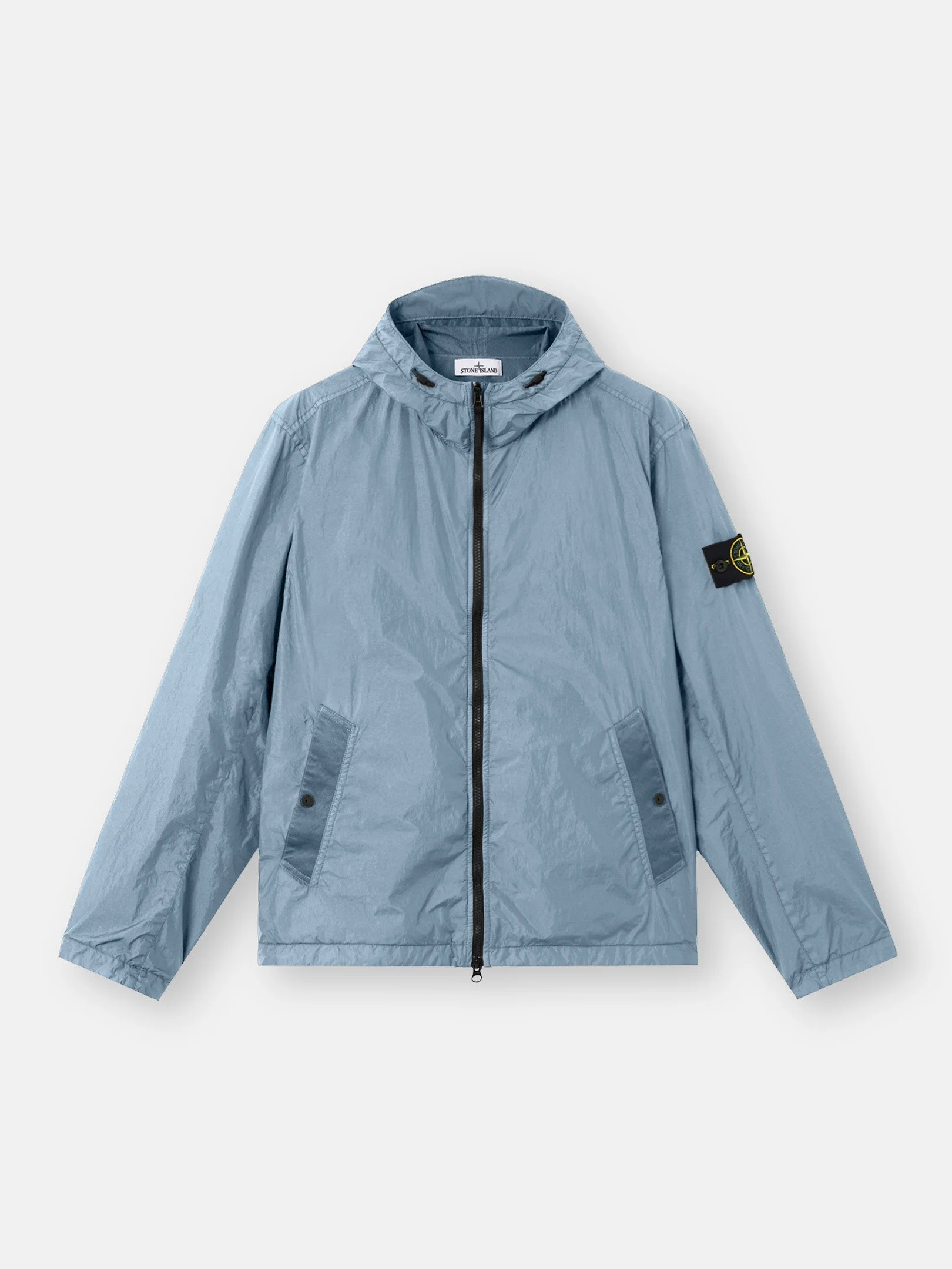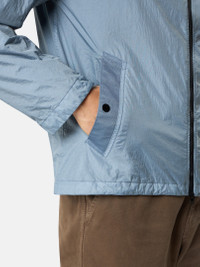 Hooded jacket in light recycled nylon rep with a crinkled appearance, featuring snap-fastened pockets, adjustable snap cuffs, and a two-way zipper. Garment dyed with anti-drop. FABRIC RESEARCH AND TREATMENT Hooded jacket in a light recycled nylon rep with an ultra-tight weaving construction. The resin coating of its inner face makes it wind resistant and mildly water resistant. Due to the resin treating of the material, the color penetrates unevenly into the material, lending a crinkled appearance to the surface. Garment dyed with the addition of a special anti-drop agent. STYLE AND FIT Hood with shaped visor and fixed elasticated drawcord with stoppers. Angled welt hand pockets with tape trim and snap. Stone Island badge on left sleeve. Adjustable cuffs with snap. Elasticated drawcord at bottom hem. Two-way zipper fastening with internal nylon tape placket. COMPOSITION AND CARE External Fabric: 100% Polyamide / Nylon Coating: 100% Polyurethanic Resin Lining: 100% Polyamide / Nylon Hood Lining: 100% Polyamide / Nylon