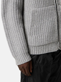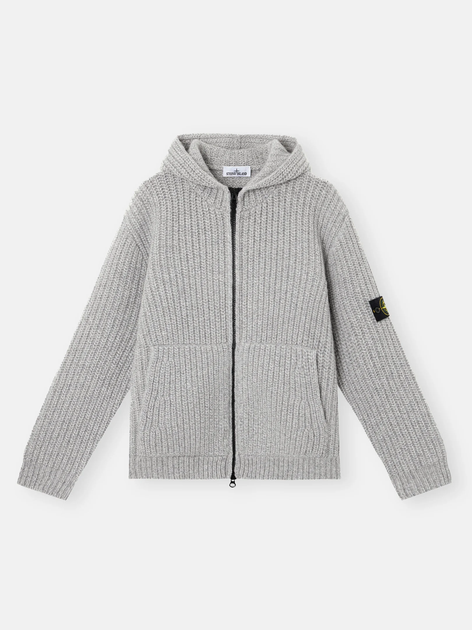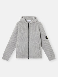 Knit hooded zipper-up sweater in fisherman's rib RWS wool and cashmere, featuring slanted patch pockets, and two-way zipper fastening. Gauge 1.5. FABRIC RESEARCH AND TREATMENT Knit hooded zipper-up sweater in RWS wool and cashmere. Fisherman's rib. Gauge 1.5. STYLE AND FIT Patch hand pockets with slanted entrances. Stone Island badge on left sleeve. Ribbed cuffs and bottom band. Two-way zipper fastening. Oversized fit. COMPOSITION AND CARE 90% Wool 10% Cashmere