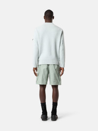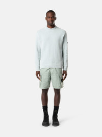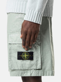 Cargo Bermuda shorts in an innovative nylon panama fabric designed to mimic natural fibers while offering greater lightness and strength, featuring multiple snap pockets. Garment dyed. FABRIC RESEARCH AND TREATMENT Cargo Bermuda shorts in an innovative Made in Japan 100% nylon fabric with an impressive organic appearance. The super-thin nylon extrusions are cut, mixed, blown, carded, twisted and spun to mimic natural fibers. The resulting panama weaved calendered fabric is lighter and stronger than natural fabrics. The garment dyeing procedure, thanks to the uneven penetration into the calendered fabric, lends a marbled look to the surface. Garment dyed using specific recipes. STYLE AND FIT Vertical hand pockets. Bellows cargo pockets with flap and concealed double snap. Stone Island badge on left cargo pocket. Back pocket with flap and concealed double snap. Zipper fly and button fastening. Loose wide leg fit. COMPOSITION AND CARE External Fabric: 100% Polyamide / Nylon Pocket Bag: 100% Polyamide / Nylon