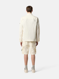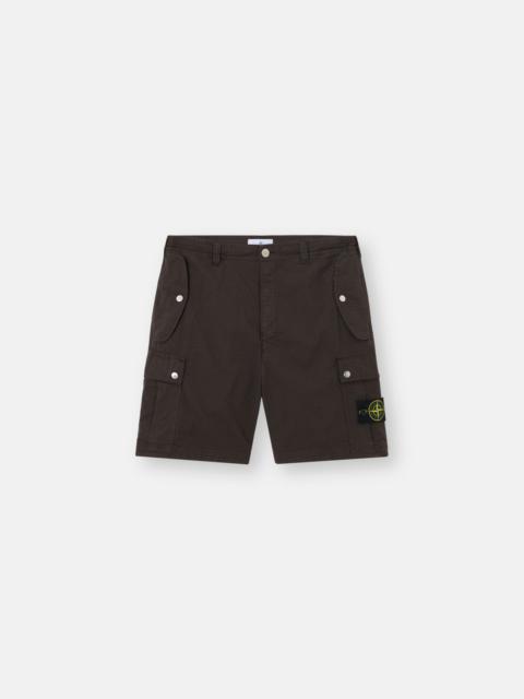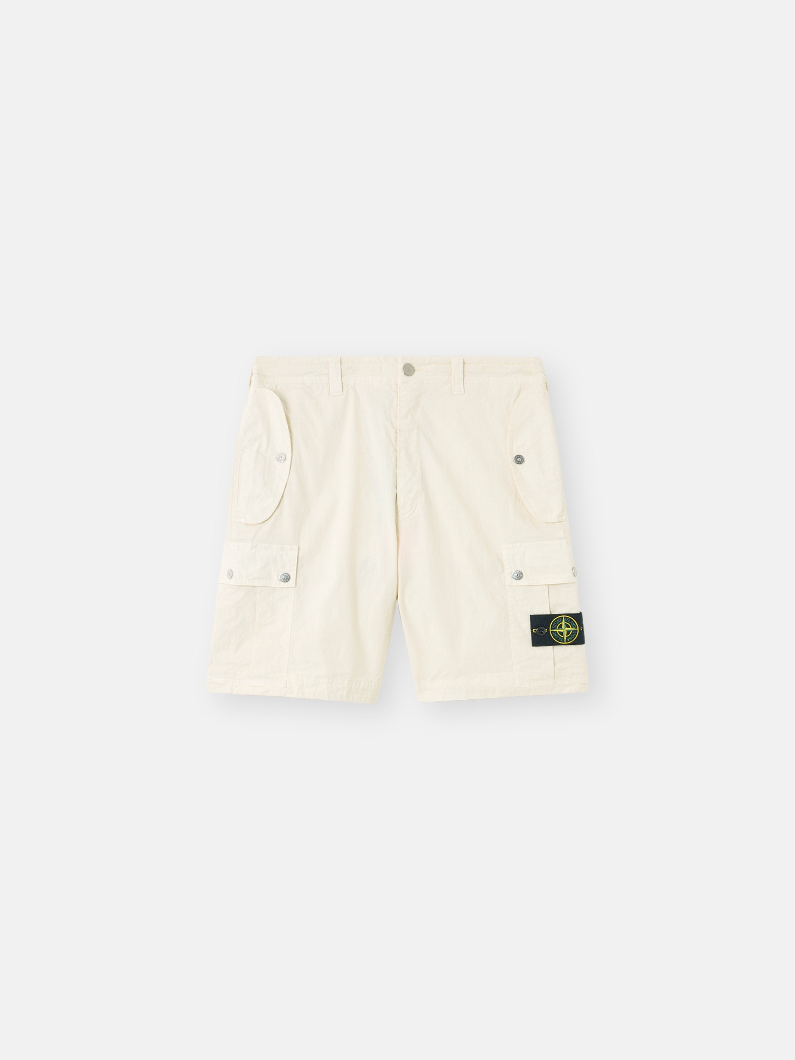 Cargo Bermuda shorts made from organic cotton ripstop with a comfortable stretch component, featuring multiple pockets and drawstring waistband. Garment dyed. FABRIC RESEARCH AND TREATMENT Cargo Bermuda shorts made of an organic cotton ripstop of military origin, with custom-made Stone Island checkering. The addition of a stretch component in the weaving lends great comfort and freedom of movement to the garment. Garment dyed using specific recipes. STYLE AND FIT Standing hand pockets with flap and snap fastening. Two back pockets with flap and snap fastening. One bellows pocket on legs with three-snap fastening; the left one features the Stone Island badge. Waistband with inner drawstring. Snap and button fly. Comfort fit. COMPOSITION AND CARE External Fabric: 95% Cotton 5% Elastane / Spandex. Pocket Bag: 100% Cotton
