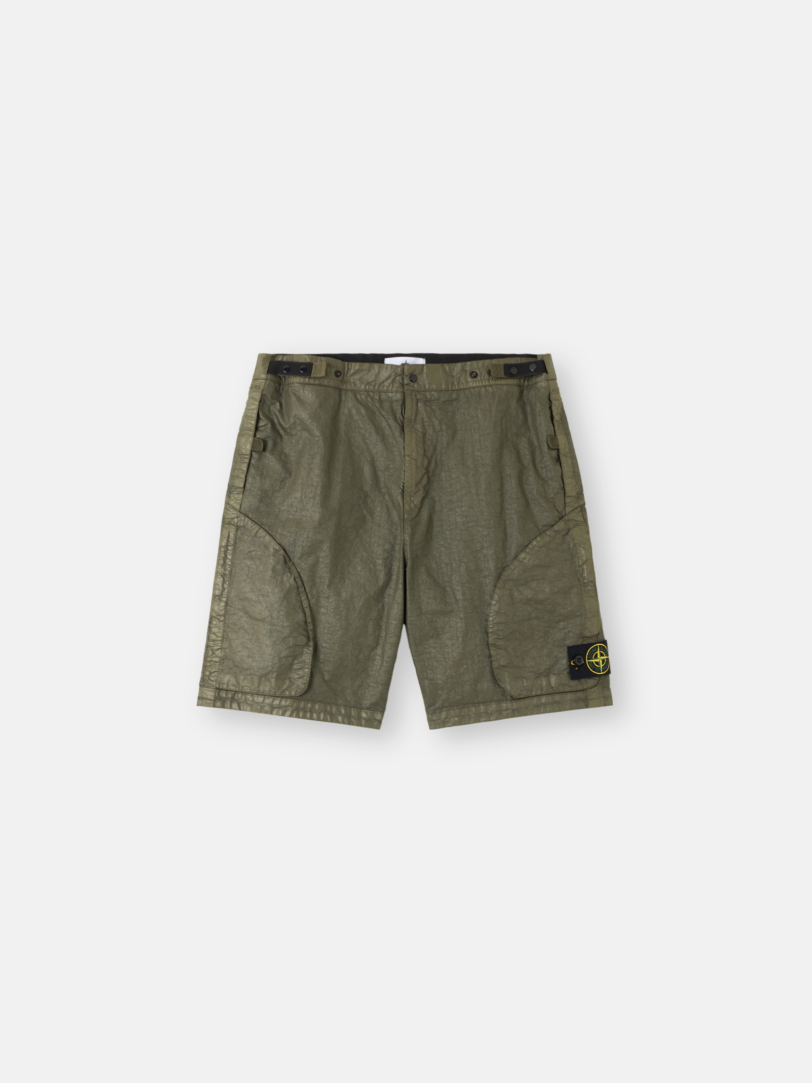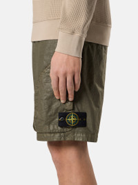 Cargo pants made from an innovative nylon that is lighter and stronger than natural fabrics, featuring multiple pockets and drawstring cuffs. The garment dyeing creates a marbled appearance. FABRIC RESEARCH AND TREATMENT Cargo pants made of an innovative Made in Japan 100% nylon fabric with an impressive organic appearance. The super-thin nylon extrusions are cut, mixed, blown, carded, twisted and spun to mimic natural fibers. The resulting Panama weaved calendered fabric is lighter and stronger than natural fabrics. The garment dyeing procedure, thanks to the uneven penetration into the calendered fabric, lends a marbled look to the surface. Garment dyed using specific recipes. STYLE AND FIT Standing hand pockets with snap fastening and nylon tape pull. V-shaped flap hiding two back pockets, with snap fastening and nylon tape pull. Ventilation eyelets under back waistband. Rounded bellows pockets with standing hidden zipper fastening; the left one features the Stone Island badge. Drawstring in leg bottoms. Adjustable elasticated tape in waistband held by snaps. Zipper and snap fly. Comfort fit. COMPOSITION AND CARE External Fabric: 100% Polyamide / Nylon. Pocket Bag: 100% Polyamide / Nylon