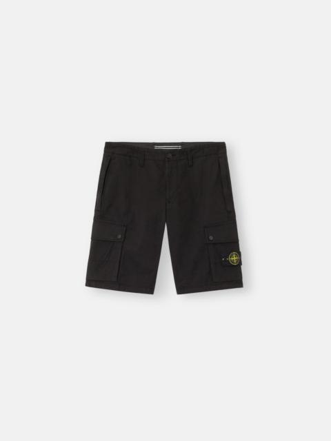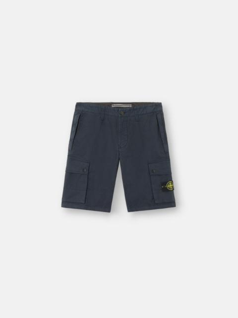 Bermuda shorts in stretch Supima® cotton twill, featuring zipper hand pockets, bellows leg pockets with diagonal flaps, and a back welt pocket. Garment dyed. FABRIC RESEARCH AND TREATMENT Bermuda shorts in stretch Supima® cotton twill, made with mercerized Supima® cotton yarn, elasticated in the weft. Supima® - Superior Pima - is the guarantee certificate for the US origin of Pima cottons. This is the noblest species among cottons, due to the greater length, uniformity and strength of the fibers. Garment dyed. STYLE AND FIT Standing hand pockets with zipper. Bellows leg pockets with diagonal flap and snaps. One back welt pocket. Stone Island badge on left leg. Zipper and button fly. Slim fit. COMPOSITION AND CARE External Fabric: 97% Cotton 3% Elastane / Spandex. Pocket Bag: 100% Cotton