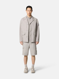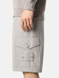 Cargo Bermuda shorts in a cotton canvas made from the finest premium cotton fibers that provide a natural weather barrier that is windproof, breathable, and durable. FABRIC RESEARCH AND TREATMENT Ghost pieces, derived from the concept of camouflage, are totally monochromatic. Even the Stone Island badge is created in a special monocolor version to blend in with the garment. Cargo Bermuda shorts made of a tightly woven cotton canvas fabric using the finest, long-staple premium organic cotton fibers. The combination of dense weaving and swelling properties of the fiber when wet provides an excellent weather barrier with no need of extra coating or lamination. It is entirely natural, offering a unique level of comfort and touch. It is windproof, breathable and very durable. STYLE AND FIT Slanted hand pockets. Two slit back pockets with hidden snap fastening. Patch pockets on legs with flap and button fastening; the left one features the Stone Island Ghost badge. Zipper and button fly. Regular fit. COMPOSITION AND CARE External Fabric: 100% Cotton. Pocket Bag: 100% Cotton