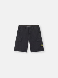 Cargo Bermuda shorts in stretch organic broken twill cotton featuring a slightly worn appearance, back snap pocket, and snap leg pocket with indent seam. Garment dyed. FABRIC RESEARCH AND TREATMENT Cargo Bermuda shorts in stretch organic broken twill cotton. Garment dyed with the 'OLD' treatment, an exclusive dyeing treatment and subsequent fading on the finished garment for a slightly worn and three-dimensional appearance. STYLE AND FIT Slanted hand pockets. One slit back pocket with hidden snap fastening. One pocket on legs, featuring a flap with indent seam and hidden two-snap fastening; the left pocket features the Stone Island badge. Zipper and button fly. Slim fit. COMPOSITION AND CARE External Fabric: 98% Cotton 2% Elastane / Spandex. Pocket Bag: 100% Cotton