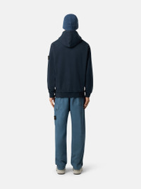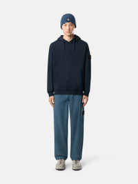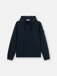 Hooded sweatshirt in brushed organic cotton fleece featuring a pouch pocket with ribbed trim, jersey-lined hood, and ribbed side bands. Garment dyed. FABRIC RESEARCH AND TREATMENT Hooded sweatshirt in brushed organic cotton fleece. Garment dyed. STYLE AND FIT Drawstring hood with cotton jersey lining. Standing-entry pouch pocket with ribbed cotton trim and inner cotton tape reinforcement. Ribbed side bands. Stone Island badge on left sleeve. Elasticated ribbed cuffs and bottom band. Regular fit. COMPOSITION AND CARE External Fabric: 100% Cotton. Secondary Fabric: 99% Cotton 1% Elastane / Spandex. Hood Lining: 100% Cotton