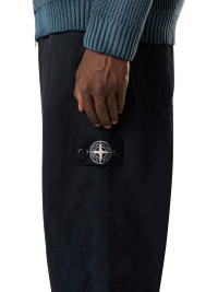 Chino pants in abrasion-resistant nylon with multiple pockets, drawstring cuffs, and elasticated waistband. Garment dyed with an innovative corrosion treatment that makes each piece unique. FABRIC RESEARCH AND TREATMENT Chino pants made from a fabric composed of mechanically spun nylon fibers that are resistant to wear and abrasion. During the spinning process, the nylon filaments are steamed to achieve a feel closer to organic fibers. Garment dyed with carefully selected dyes, then faded through an innovative corrosion treatment, reflecting Stone Island's ongoing commitment to research and experimentation. The corroded areas, particularly where the fabric is thicker, take on varied colors due to the irregularity of the treatment, creating a slightly worn effect and making each piece unique. STYLE AND FIT Slanted hand pockets. Back patch pockets with snaps under flap. White Stone Island fabric research badge on left leg. Nylon tape drawstring in cuffs. Elasticated waistband with internal drawstring. Button fly. Loose fit. COMPOSITION AND CARE 100% Polyamide / Nylon