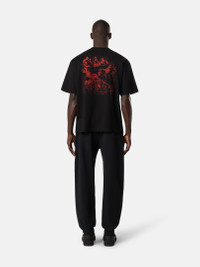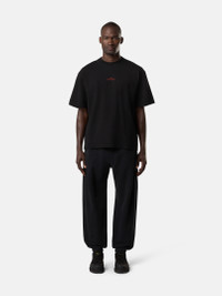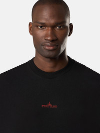 Short-sleeve T-shirt in combed and mercerized cotton jersey with 'Megacity Sky' embroidery, featuring a logo on the chest and abstract city motif on the back. Garment dyed. FABRIC RESEARCH AND TREATMENT Short-sleeve T-shirt in combed organic cotton jersey and mercerized cotton jersey with ‘Megacity Sky’ embroidery. Garment dyed. STYLE AND FIT Ribbed neckline. Stone Island logo embroidery on chest. Embroidery of abstract city motif and Stone Island lettering on back. Regular fit. COMPOSITION AND CARE External Fabric: 100% Cotton. Ribbing: 100% Cotton. Decoration: 100% Polyester