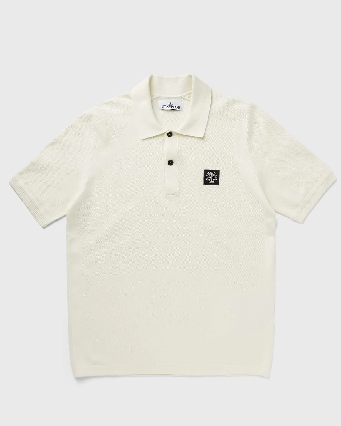 The short-sleeved Stone Island knitted polo shirt made of soft organic cotton comes with smooth knitted stripes, a characteristic Compass patch and ribbed details. - Ribbed neckline with two buttons - Raglan sleeves - Stone Island patch with Compass logo - Ribbed sleeve cuffs - Regular fit Article Number: K1S155100033S00B5.V0093 Gender: Men Color: IVORY Material: 100% Cotton