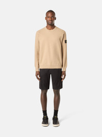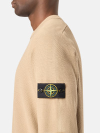 Knit crewneck sweater made from soft organic cotton with stockinette stitch bands, featuring raglan sleeves and ribbed details. Gauge 14. FABRIC RESEARCH AND TREATMENT Knit crewneck sweater in soft organic cotton. Moss stitch, with stockinette stitch bands. Gauge 14. STYLE AND FIT Ribbed neckline. Raglan sleeves. Stone Island badge on the left sleeve. Ribbed cuffs and bottom band. Loose fit. COMPOSITION AND CARE 100% Cotton