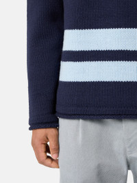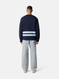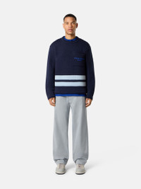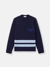 Knit crewneck sweater in pure wool featuring a chest pocket with Marina lettering print, contrast stripes near the hem, and rolled-edge ribbed trims. Gauge 3. FABRIC RESEARCH AND TREATMENT Knit crewneck sweater in pure wool. Stockinette stitch. Gauge 3. STYLE AND FIT Ribbed neckline with rolled edge. Chest patch pocket with print of Stone Island Marina lettering. Two large contrast-colored stripes near bottom. Ribbed cuffs and bottom band with rolled edge. Oversized fit. COMPOSITION AND CARE 100% Virgin Wool