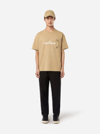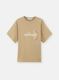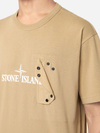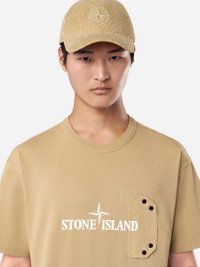 T-shirt in cotton jersey featuring a snap chest pocket, a logo print on the chest overlapping the pocket flap, and nylon tape applique details. Garment dyed. FABRIC RESEARCH AND TREATMENT Short-sleeve T-shirt in cotton jersey. Garment dyed. STYLE AND FIT Ribbed neckline. Chest pocket with cotton twill standing flap and snap fastening. Print of the Stone Island logo in the middle of the chest, overlapping on the pocket flap. Nylon tape applique on back of sleeves and shoulders. Regular fit. COMPOSITION AND CARE External Fabric: 100% Cotton. Pocket: 100% Cotton