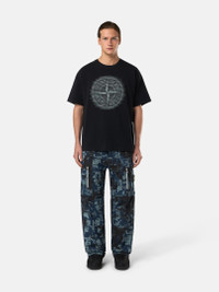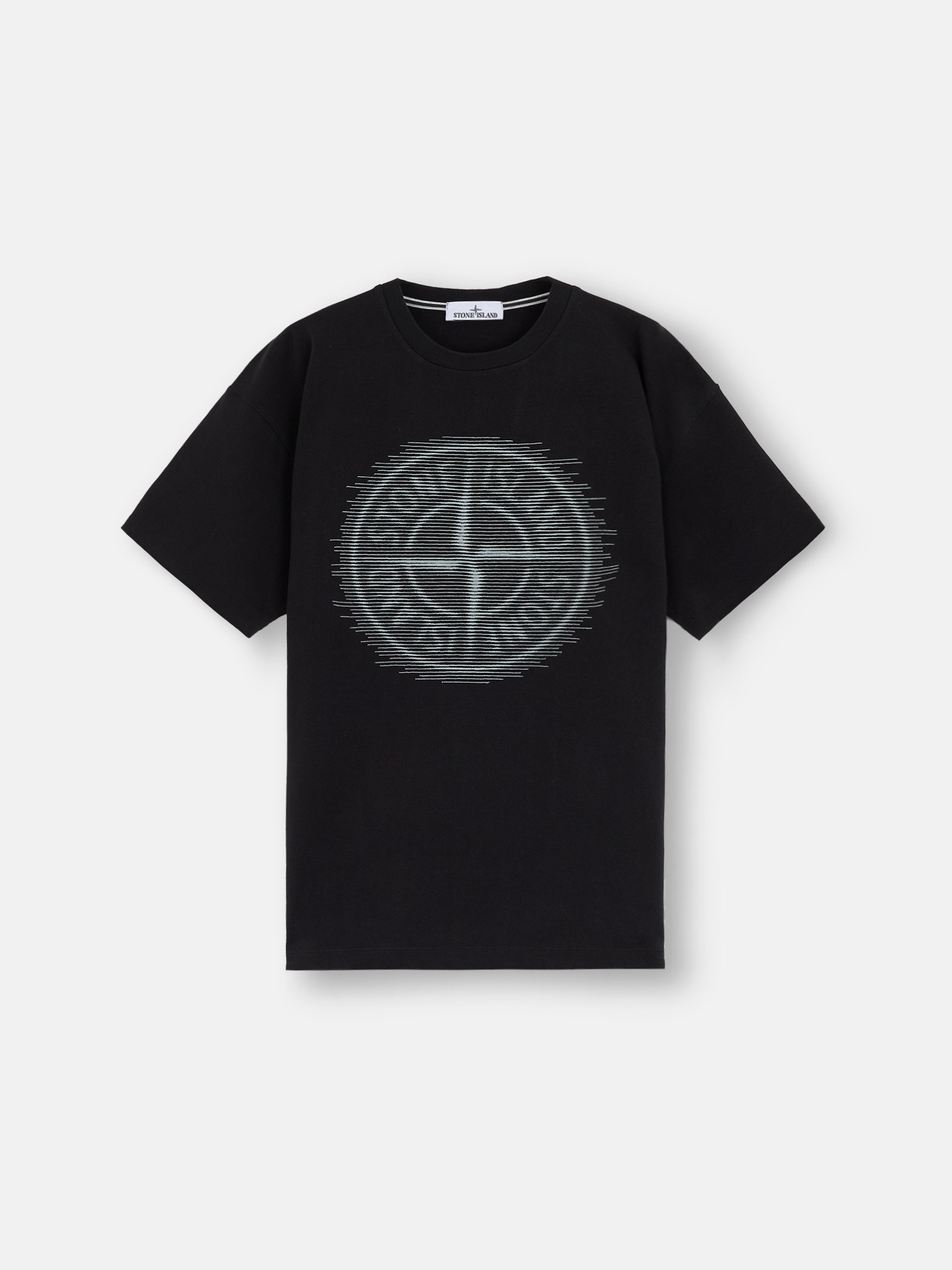 T-shirt in cotton jersey featuring the 'Optical Two' print motif on the front with thin embroidered lines forming an optical render of the logo. Garment dyed. FABRIC RESEARCH AND TREATMENT Short sleeve T-shirt in cotton jersey. Garment dyed. STYLE AND FIT Ribbed neckline. 'Optical Two' embroidery of thin horizontal embroidered lines forming an optical render of the Stone Island Compass logo on the front. Small print of the Stone Island Compass logo under the neckline on back. Regular fit. COMPOSITION AND CARE 100% Cotton
