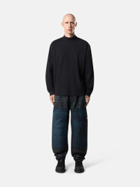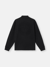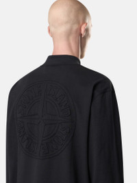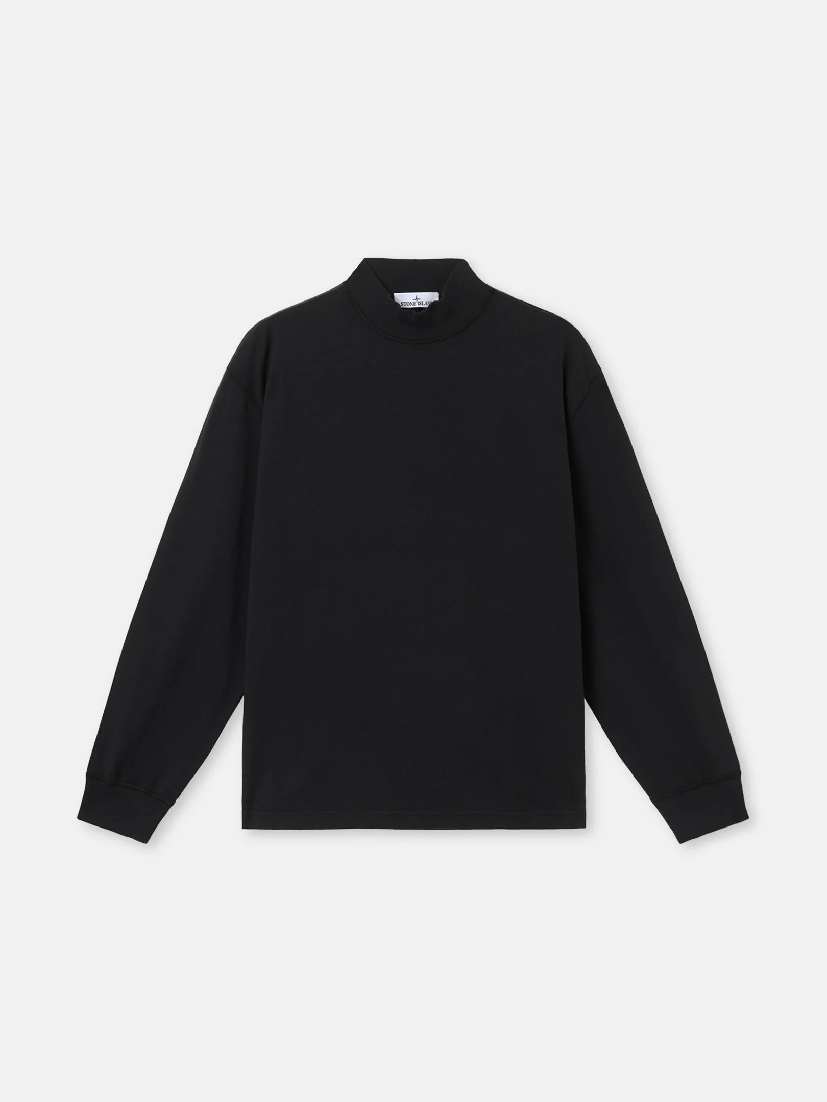 Long-sleeve mock neck T-shirt in combed organic cotton jersey featuring tonal Compass embroidery on the back, ribbed cuffs, and overlock seams. Garment dyed. FABRIC RESEARCH AND TREATMENT Long-sleeve mock neck T-shirt in combed organic cotton jersey. Garment dyed. STYLE AND FIT Ribbed mock neckline. Stone Island Compass logo embroidery with same fabric on back. Ribbed cuffs. Overlock seams. Oversized fit. COMPOSITION AND CARE Garment: 100% Cotton. Ribbing: 94% Cotton 6% Elastane / Spandex