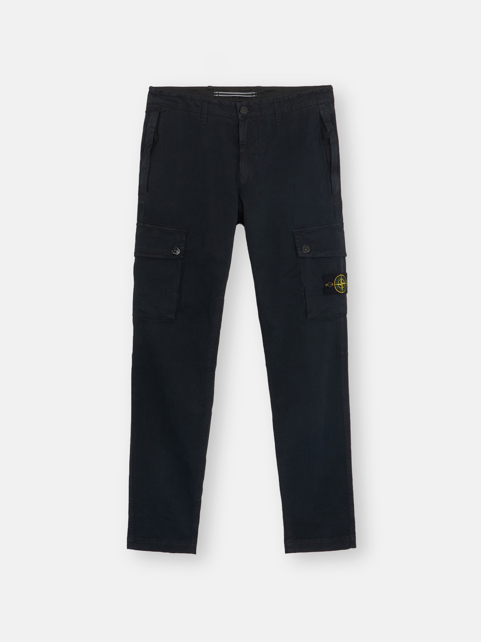 Cargo pants in stretch broken-twill organic cotton garment dyed with the exclusive 'OLD' treatment, lending a slightly worn and three-dimensional appearance to the item. FABRIC RESEARCH AND TREATMENT Cargo pants in stretch broken-twill organic cotton. Garment dyed with the ‘OLD’ effect, an exclusive dyeing treatment and subsequent fading on the finished garment to create a slightly worn and three-dimensional appearance. STYLE AND FIT Welt pockets with zipper closure. One slit pocket with hidden snap fastening on the back. Bellows pocket on each leg with flap and snap fastenings; the left one features the Stone Island badge. Zipper and button fly. Slim fit. COMPOSITION AND CARE External Fabric: 97% Cotton 3% Elastane / Spandex. Lining: 100% Cotton