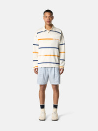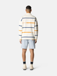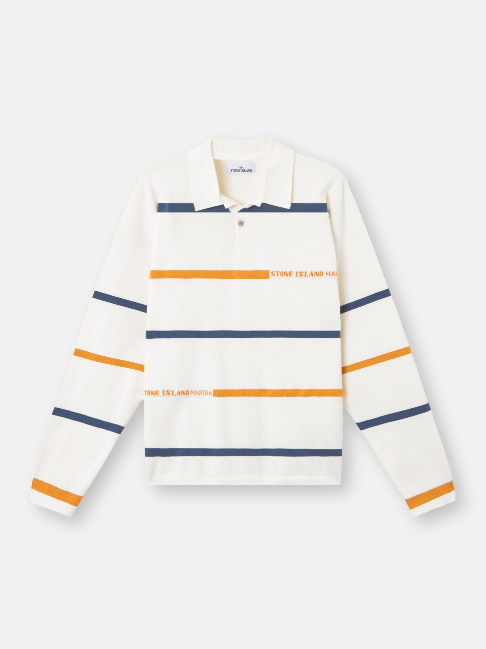 Striped knit polo shirt made from soft organic cotton featuring a cotton canvas collar, one button at the neck, and Stone Island Marina lettering. Gauge 12. FABRIC RESEARCH AND TREATMENT Knit polo shirt in striped soft organic cotton. Stockinette stitch. Gauge 12. STYLE AND FIT Cotton canvas collar on herringbone cotton tape. Single button fastening at the neck. Drop shoulders. Two of the stripes on the front and back feature a jacquard construction with Stone Island Marina lettering. Flat cuffs and bottom band. Oversized fit. COMPOSITION AND CARE 100% Cotton