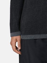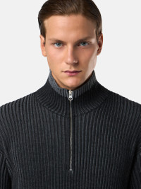 Knit half-zipper sweater in RWS-certified wool, vanise knitted to obtain a deeper perception of the rib and contrasting color placements. 7 gauge. FABRIC RESEARCH AND TREATMENT Half-zipper in full-rib knit made of two different-colored yarns of RWS-certified wool, vanise knitted to obtain a deeper perception of the rib and contrasting color placements. 7 gauge. The Responsible Wool Standard (RWS) describes and certifies animal welfare and land management practices in wool production and tracks the certified material from farm to final product. STYLE AND FIT Standing collar with zipper closure. Stone Island badge on the left sleeve. Loose fit. COMPOSITION AND CARE Outside: 100% Virgin Wool. Inside: 100% Virgin Wool