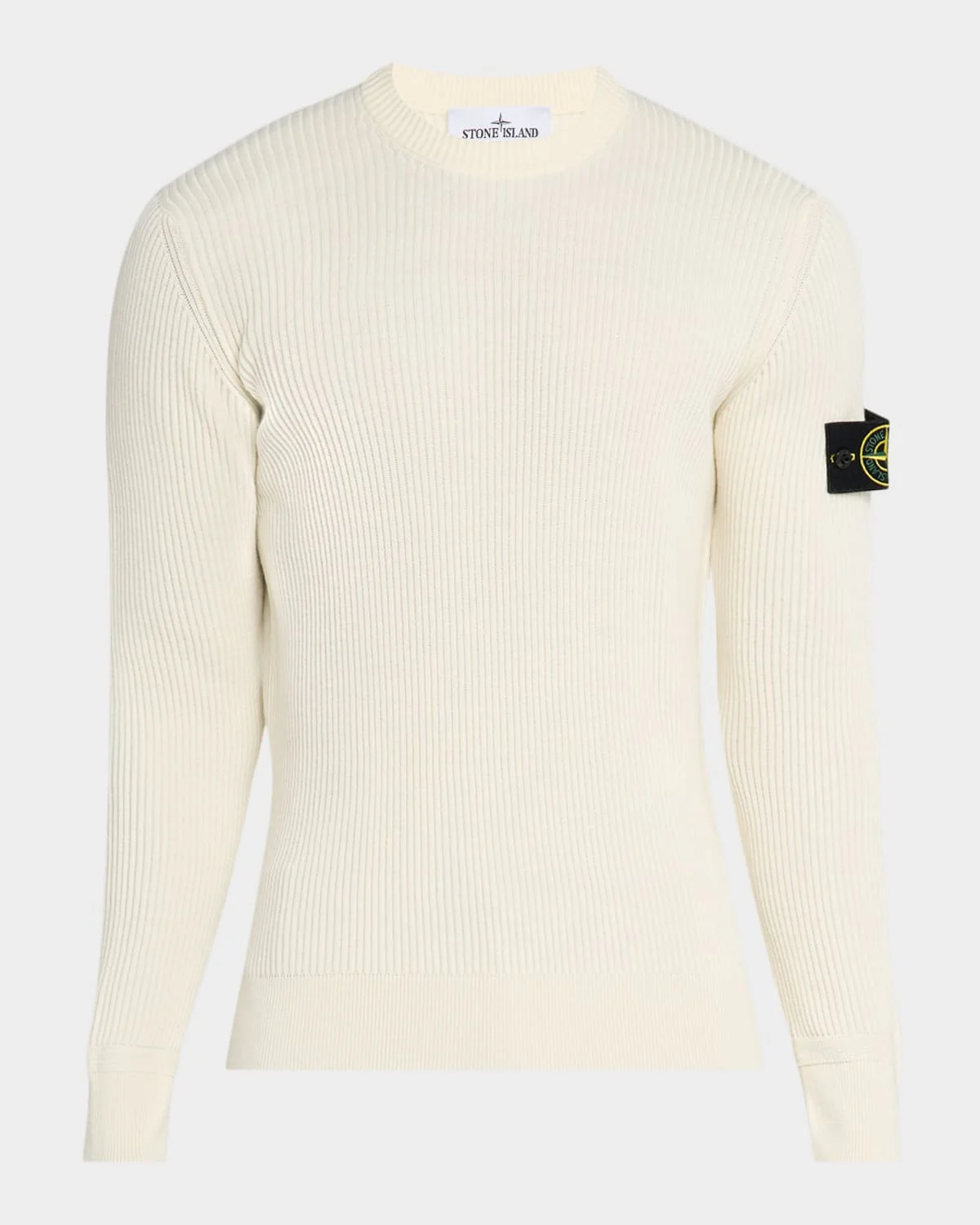 - Stone Island introduces its rendition of the classic rib-knit sweater. The cuffs and hem of the sweater are finely ribbed for a touch of contrast to the virgin wool pullover. - Gauge 12 - Crew neckline - Logo badge on the left arm - Pullover style - Classic fit - Virgin wool - Hand wash or dry clean - Imported