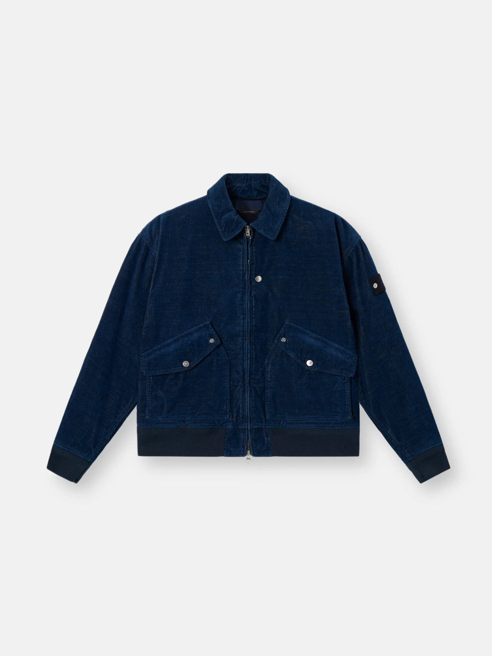 Bomber jacket in finely ribbed corduroy composed of indigo-dyed cotton and white polyester, featuring snap pockets, ribbed trims, and light polyester padding. Rinsed. FABRIC RESEARCH AND TREATMENT Bomber jacket made from a finely ribbed corduroy composed of indigo-dyed cotton and white polyester, directly inspired by the colors of denim and with a distinctive ridged texture. The finished garment is rinsed. The application of indigo dye to corduroy, a material typically not associated with this treatment, reflects Stone Island’s ongoing dedication to textile innovation. Light polyester padding. STYLE AND FIT Slanted patch hand pockets with triangular flap and three snaps, over second standing hand pockets. Inner chest pocket with button and Compass logo embroidery. Stone Island Denim Research badge with metal buttons on left sleeve. Ribbed elasticated cuffs and bottom band. Hidden two-way zipper fastening with one snap, visible on the outside, on internal placket. COMPOSITION AND CARE External Fabric: 85% Cotton 15% Polyester. Ribbing: 100% Polyester. Lining: 100% Cotton. Sleeve Lining: 100% Polyester. Padding: 100% Polyester