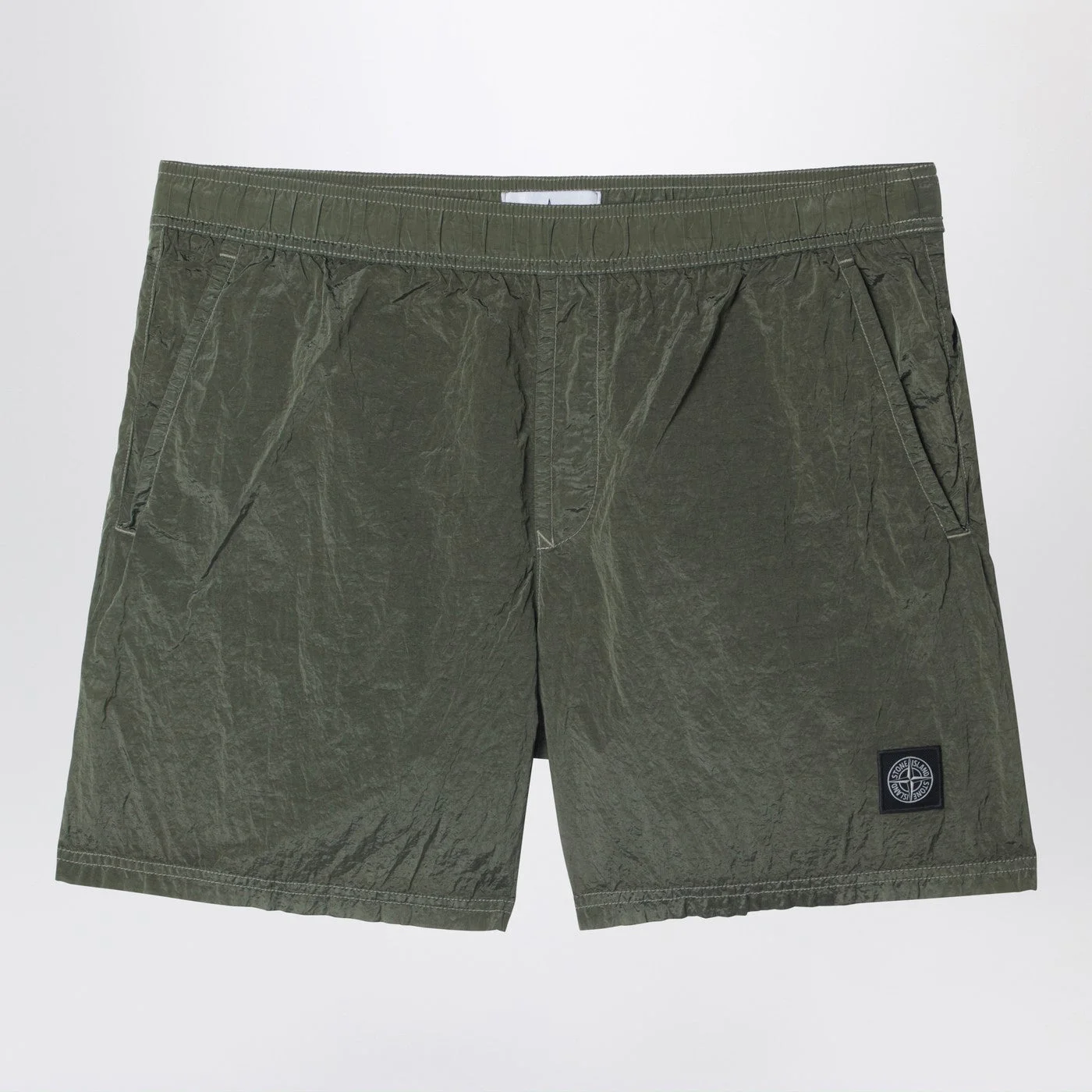 Stone Island swim shorts in military green nylon• Two side pockets• One rear patch pocket with zip• Compass logo patch on the front• Elasticated waistband with drawstring• Mid length• Regular fit