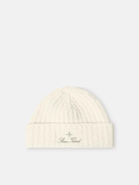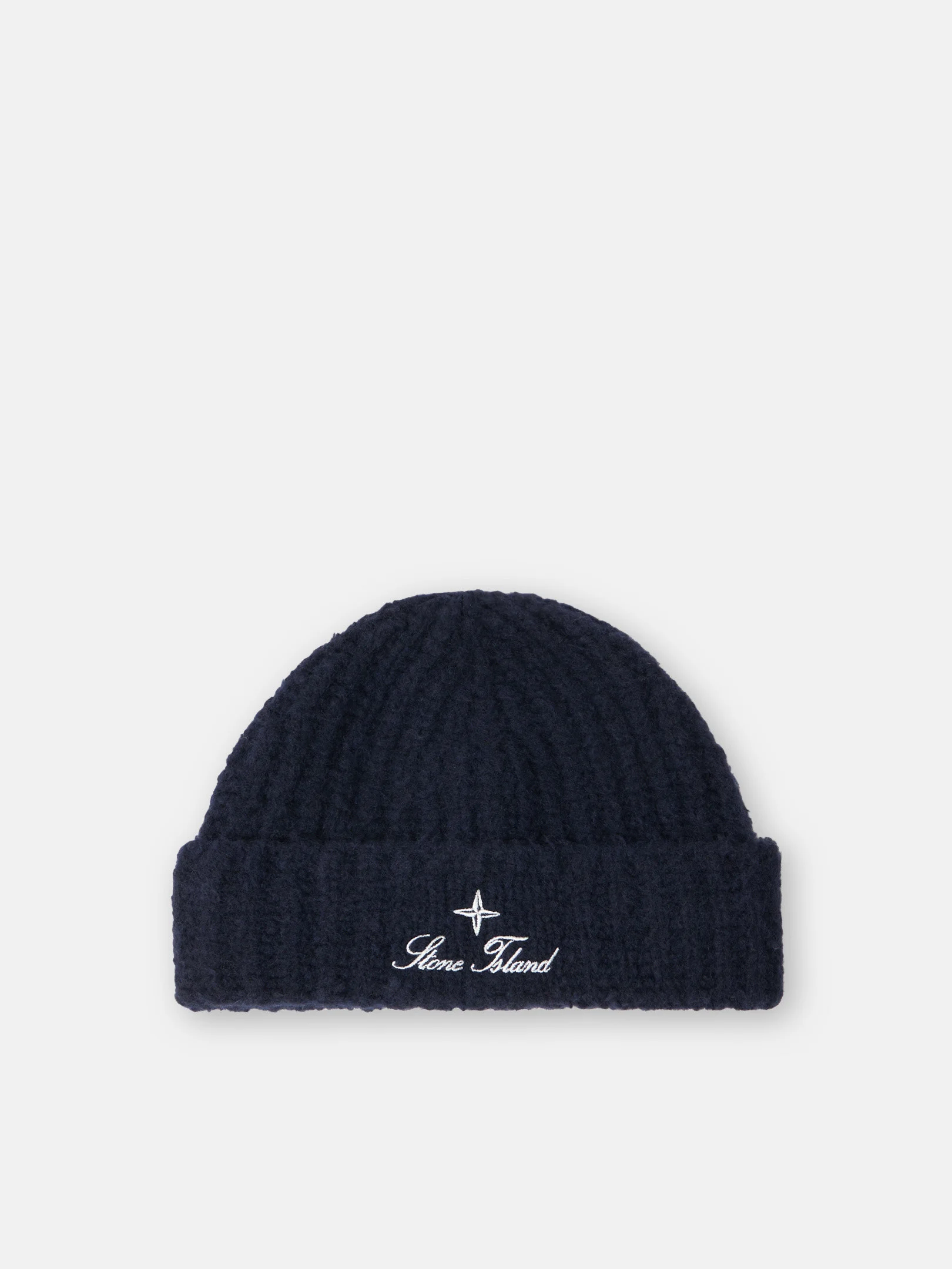 Beanie in wool nylon boucle with fisherman’s rib, featuring an archival Stone Island logo on the cuff. Gauge 3. FABRIC RESEARCH AND TREATMENT Beanie in wool nylon boucle. Fisherman's rib. Gauge 3. STYLE AND FIT Embroidered archival Stone Island logo at cuff. COMPOSITION AND CARE 58% Wool 42% Polyamide / Nylon