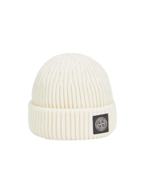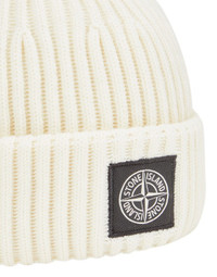 FABRIC RESEARCH AND TREATMENT Beanie in full-ribbed wool. 7 gauge. STYLE Stone Island Compass patch logo on the cuff. COMPOSITION 100% Virgin wool