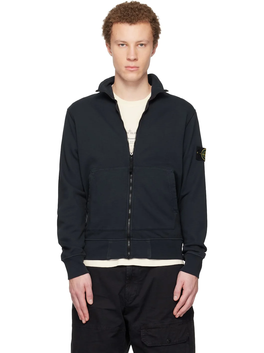 Organic cotton French terry jacket. · Garment-dyed · Stand collar · Zip closure · Patch pockets at waist · Rib-knit hem and cuffs · Detachable felted logo patch at sleeve Supplier color: Navy blue Body: 100% organic cotton. Trim: 99% cotton, 1% elastane. Made in Tunisia 261828M202008