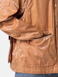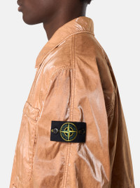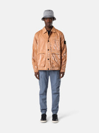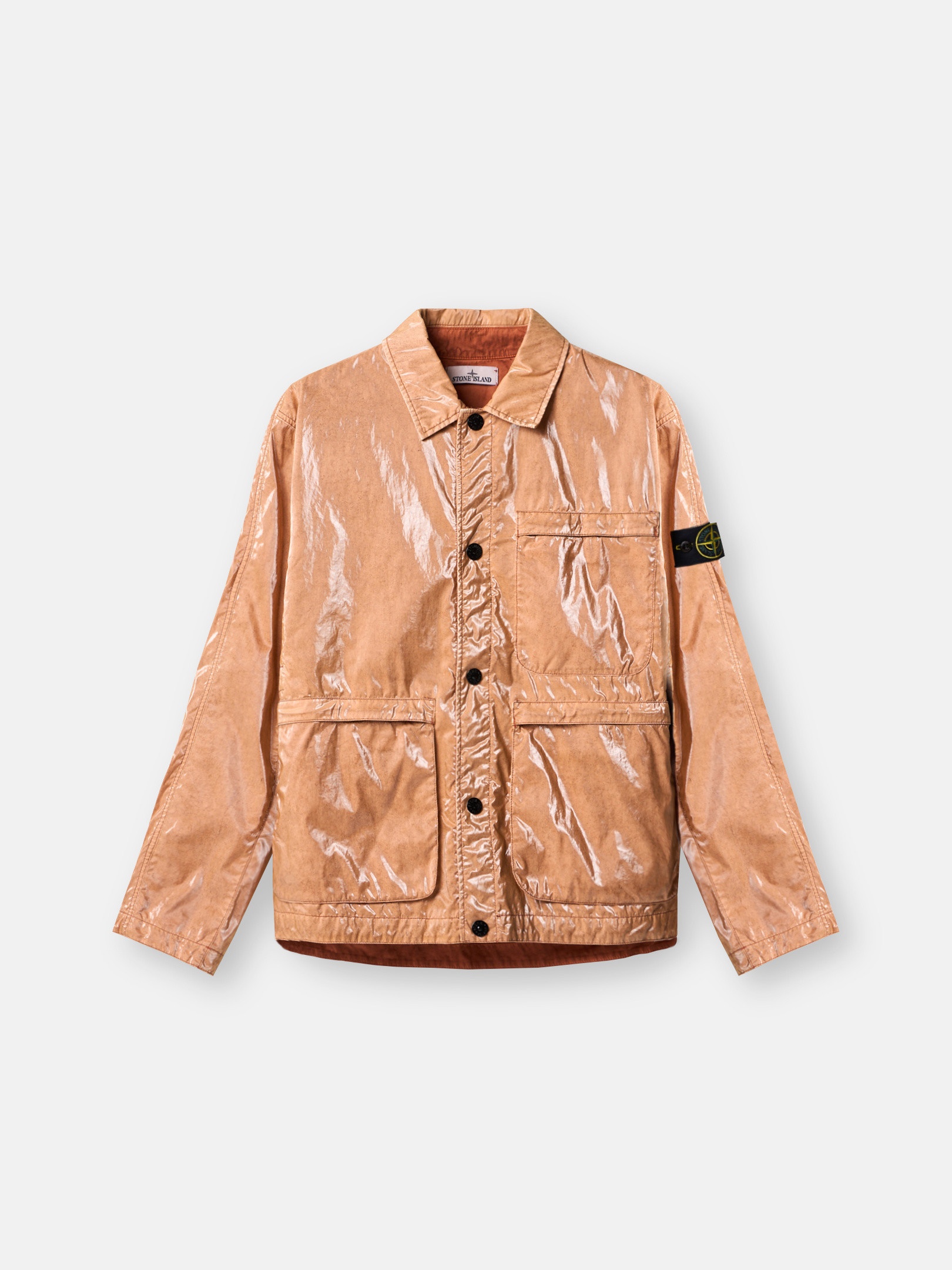 Coach jacket made from a very light cotton muslin bonded to a glossy, water- and wind-resistant polyurethane film. A special resin bath treatment creates a speckled appearance. FABRIC RESEARCH AND TREATMENT Coach jacket made in Mussola Prismatica ‘Pietra’. An evolution of the Stone Island Mussola Prismatica, this fabric is engineered by bonding a very light cotton muslin with a glossy, finely grooved, water- and wind-resistant transparent polyurethane film. Through a special resin bath treatment on the finished garment and subsequent pigment dyeing, the inner muslin layer takes on a superficial and non-uniform coloring, while the prismatic polyurethane film absorbs the color with a speckled effect typical of stones. Each garment is unique and unrepeatable. Cotton canvas lining. STYLE AND FIT One patch chest pocket with hidden zipper fastening. Bellows hand pockets with hidden zipper fastening. Stone Island badge on the left sleeve. Under-sleeve vents. Adjustable snap at cuffs. Raglan sleeves on back. Vertical cotton tape applique on center of back. Large vent panel with inner cotton mesh lining. Below, a detachable panel featuring two bellows pockets with flap and hook-and-loop fastening; the panel is attached to the garment through an adjustable cotton belt and snapped loops. Snap-button fastening. COMPOSITION AND CARE External Fabric: 100% Cotton. Coating: 100% Polyurethanic Resin. Front Lining: 100% Cotton. Yoke Lining: 100% Cotton