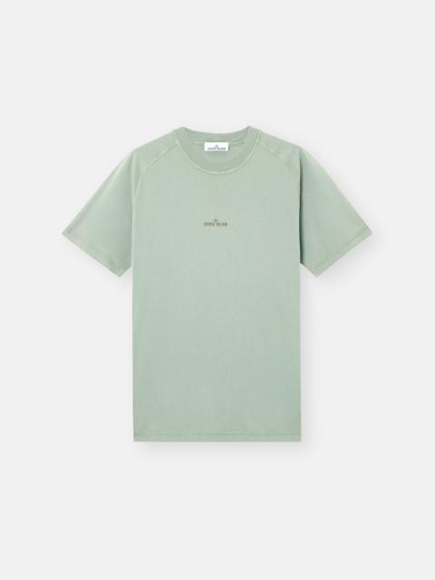 Short-sleeve T-shirt in organic cotton jersey with two-needle overlock seams, Stone Island logo on chest, and slightly reflective 'Institutional Two' print. Garment dyed. FABRIC RESEARCH AND TREATMENT Short-sleeve T-shirt in organic cotton jersey. Garment dyed. STYLE AND FIT Ribbed neckline. Raglan sleeves. Two-needle overlock seams on neckline, shoulders, sleeves, and bottom hem. Slightly reflective 'Institutional Two' print of the Stone Island logo on center of chest. Small print of the Stone Island Compass logo under back neckline. Slim fit. COMPOSITION AND CARE Garment: 100% Cotton. Ribbing: 100% Cotton
