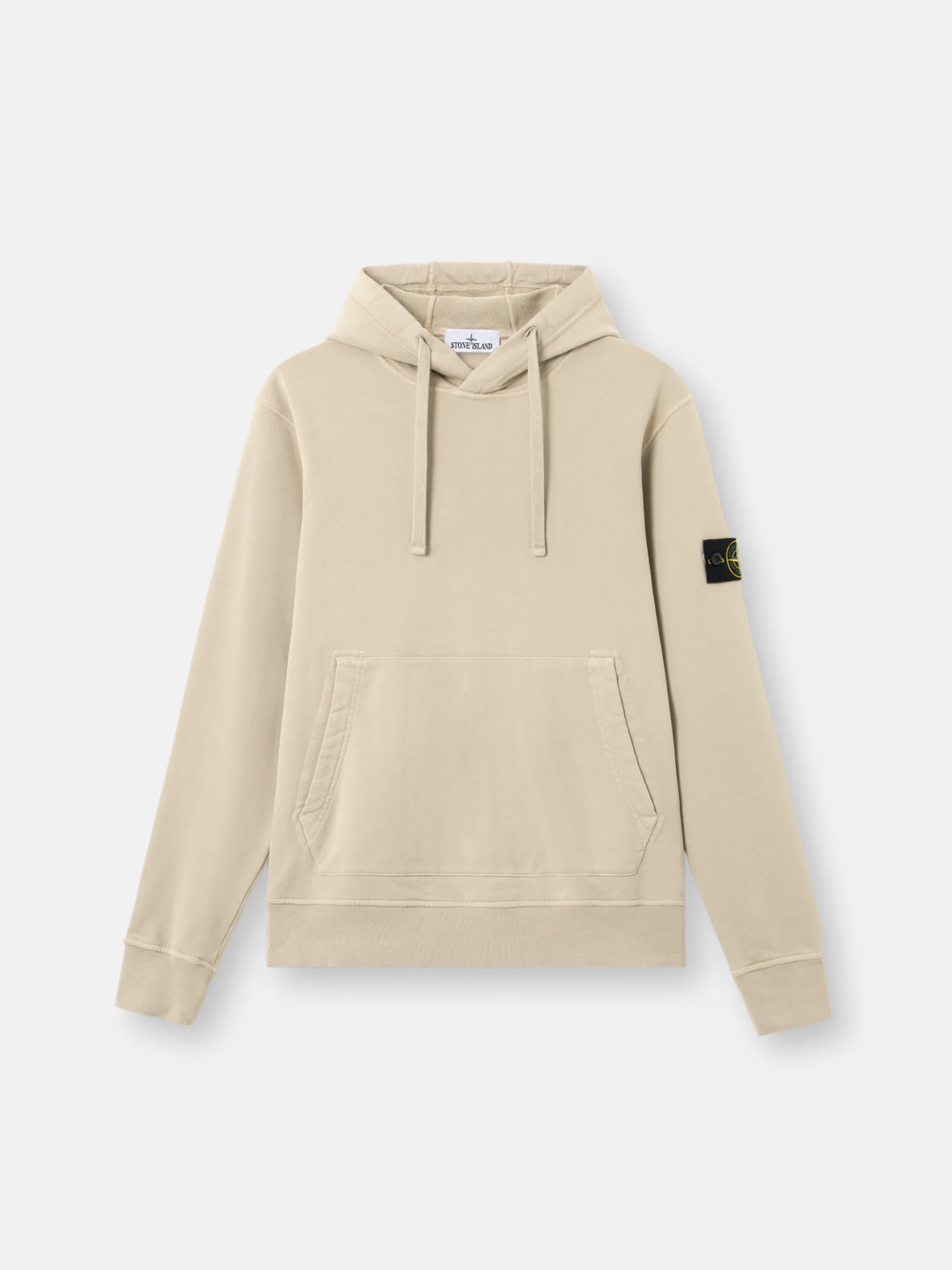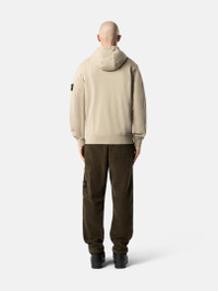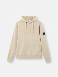 Hooded sweatshirt in organic cotton fleece featuring overlock seams, a pouch pocket with slanted entrances, and elasticated ribbed trims. Garment dyed. FABRIC RESEARCH AND TREATMENT Hooded sweatshirt in organic cotton fleece. Garment dyed. STYLE AND FIT Drawstring hood. Overlock seams. Pouch pocket with slanted entrances. Stone Island badge on left sleeve. Lunette under back neckline with inner lining. Elasticated ribbed cuffs and bottom band. Regular fit. COMPOSITION AND CARE External Fabric: 100% Cotton. Ribbing: 98% Cotton 2% Elastane / Spandex