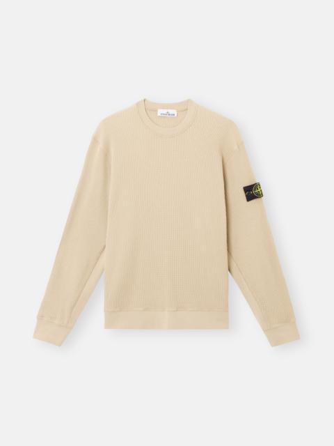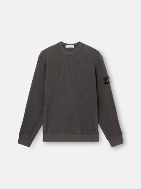 Crewneck sweatshirt in organic cotton waffle fleece with overlock seams and ribbed inlay details on the sides and under the sleeves. FABRIC RESEARCH AND TREATMENT Crewneck sweatshirt in organic cotton waffle fleece. STYLE AND FIT Ribbed neckline. Stone Island badge on the left sleeve. Overlock seams. Ribbed inlay on the sides and under the sleeves. Ribbed cuffs and bottom band. Regular fit. COMPOSITION AND CARE Garment: 100% Cotton. Ribbing: 95% Cotton 5% Elastane / Spandex
