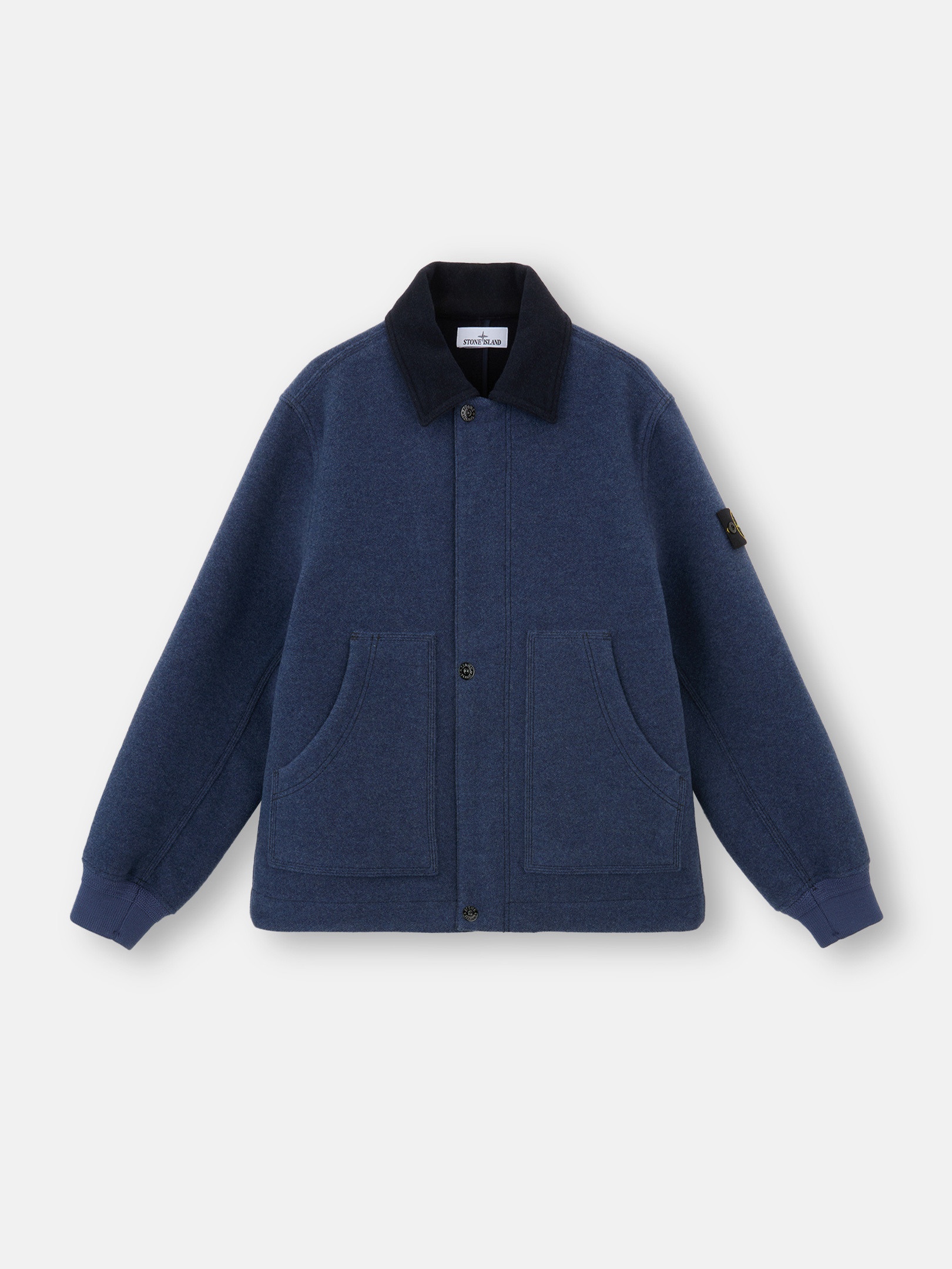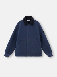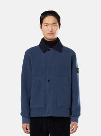 Jacket in wool nylon gauze cloth with double-weave construction, featuring a contrasting interior and exterior, wool cloth collar, pockets, and two-way zipper. FABRIC RESEARCH AND TREATMENT Jacket made from wool nylon gauze cloth. The double weave construction, inspired by military blankets, creates contrasting colors between the exterior and interior of the garment. STYLE AND FIT Plain-colored wool cloth collar. Patch hand pockets with rounded side entrance. Ribbed cuffs. Stone Island badge on the left sleeve. Two-way zipper fastening hidden under snap-fastened placket. COMPOSITION AND CARE Outside: 82% Wool 18% Polyamide / Nylon. Lining: 100% Cotton