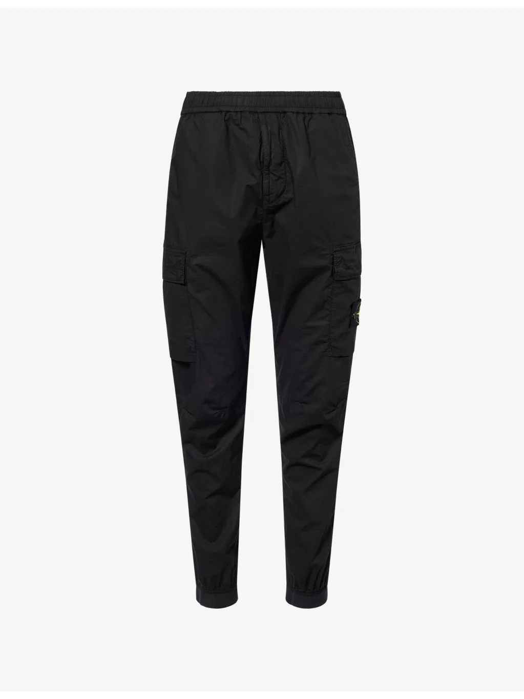 PRODUCT DETAILS - Stone Island cotton trousers - 97% cotton, 3% elastane - Concealed zip fastening at front - Relaxed fit, elasticated drawstring waistband, slim leg, two side slip pockets, two side cargo flap pockets, one rear snap pocket, detachable logo badge at side, elasticated cuffs, garment dyed - Machine wash at 30°C - Size medium: rise 12in / 30cm, inside leg 29in / 74cm, leg opening 12in / 31cm - Model is 6ft 2in/1.88m and wears a size medium - Lightweight, non-stretch Ref: R04564875