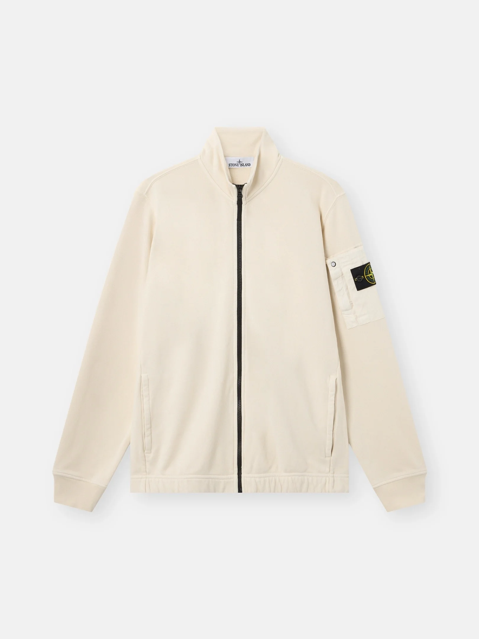 Track jacket in cotton fleece featuring the seasonal ripstop patch pocket with pleat detail on the sleeve, elasticated hem, and zipper fastening. Midweight. Garment dyed. FABRIC RESEARCH AND TREATMENT Track jacket in cotton fleece with cotton ripstop seasonal pocket. Midweight. Garment dyed. STYLE AND FIT Double-layer stand collar. Vertical hand pockets with internal cotton tape reinforcement. Internal top-entry pockets. Cotton ripstop patch pocket on left sleeve with hook-and-loop fastening along top and side, snap and loop at corner, pleat detail, and Stone Island badge. Ribbed cuffs. Elasticated hem. Zipper fastening. Regular fit. COMPOSITION AND CARE External Fabric: 100% Cotton Pocket: 100% Cotton Ribbing: 99% Cotton 1% Elastane / Spandex