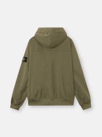 Hooded jacket in a three-ply performance material with 8000 MM water column, featuring zipper pockets, ribbed trims, and a two-way zipper. FABRIC RESEARCH AND TREATMENT Hooded jacket in a three-ply performance material with an 8000 MM water column. The polyester stretch canvas outer face is woven with yarns using the e.dye® Waterless Color System™ technology, the innovative yarn color saturation system. The fabric is laminated to a breathable, water- and wind-resistant inner membrane, protected by a textured polyester jersey backing layer. The outer structure of the material gives great flexibility and comfort to the garment. STYLE AND FIT Hood with internal drawstring. Angled hand pockets with concealed zipper. Stone Island badge on left sleeve. Ribbed cuffs and bottom band. Back yoke. Two-way zipper fastening on tape under snap placket. COMPOSITION AND CARE Garment: Outer Layer: 92% Polyester 8% Elastane / Spandex Membrane: 100% Polyurethanic Resin Inner Layer: 100% Polyester Ribbing: 98% Polyester 2% Elastane / Spandex