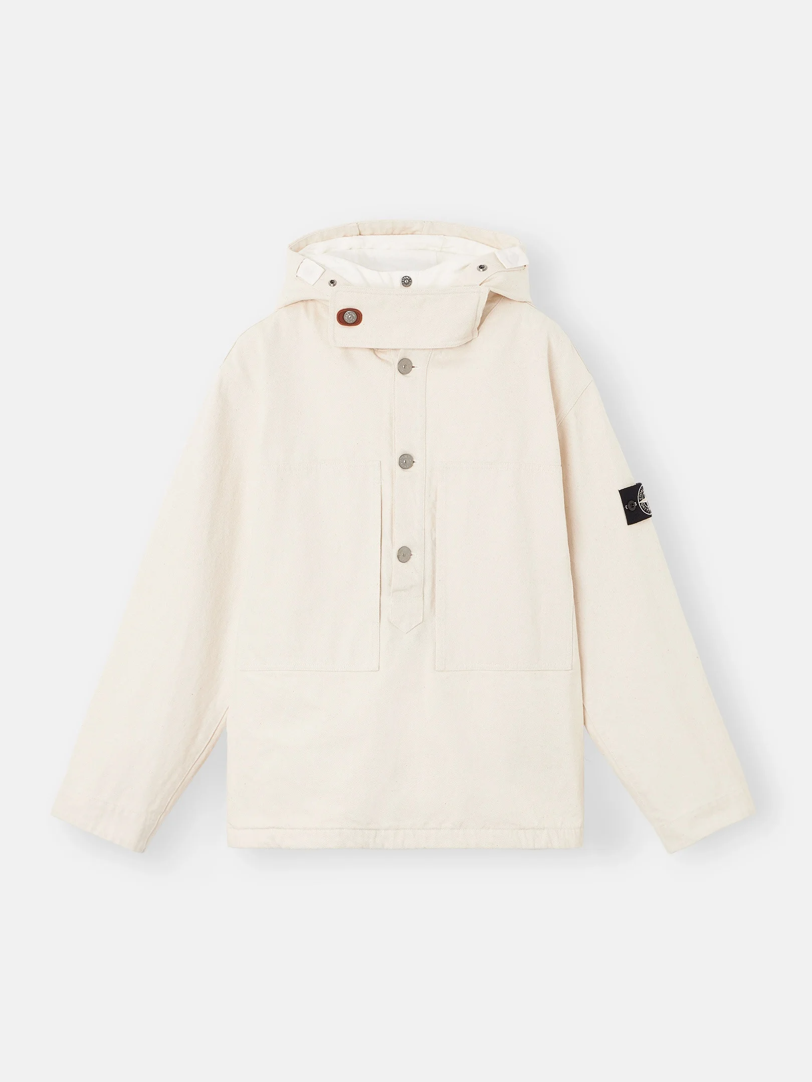 Anorak made in part with recycled cotton derived from an elaborate recovery and regeneration process that reuses material scraps from the Stone Island production chain. Washed. FABRIC RESEARCH AND TREATMENT Anorak in natural cotton gabardine. Washed. The Stone Island Raw Beauty project reuses cotton material scraps from the Stone Island production chain. The scraps selected in the production plants are reprocessed to obtain new blended yarns, containing at least 50% recovered material. The fabrics derived from this elaborate recovery and regeneration process are used for new garments. This garment is made from 60% recycled cotton and 40% conventional cotton. The unbleached fabric features some aesthetic impurities that are typical of raw cotton and should be considered an intrinsic and natural part of the material. Detachable hood lining in cotton canvas and cotton jersey. STYLE AND FIT Hood with cotton tape drawstring that can be fastened with snaps. Chin strap that can also be fastened back onto hood with buttonhole detail inspired by debossed rubber patches of archival Stone Island garments from the 1980s. Three-button neck fastening. Large standing patch chest pockets. Standing on-seam hand pockets. White Stone Island fabric research badge on left sleeve. Button at cuffs with rubber buttonhole detail. Detachable hood lining with snap fastening that can be attached to the outer garment using a system of ties adapted from those used in the sailing world. COMPOSITION AND CARE Garment: 100% Cotton. Hood: 100% Cotton. Hood Padding: 50% Cotton 50% Polylactide / Pla