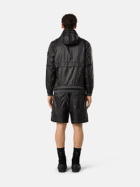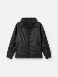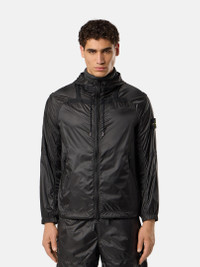 Hooded jacket in high-tenacity ripstop nylon that is lightweight yet extremely durable, featuring reflective tape details, transparent inner pockets, and two-way zipper. Treated with anti-drop. FABRIC RESEARCH AND TREATMENT Light hooded jacket in a high-tenacity ripstop nylon 6.6 that is lightweight yet extremely durable. The semi-transparent fabric is double layered on some parts of the garment, highlighting its geometry. Treated with a specific anti-drop agent. STYLE AND FIT Hood with secured drawstring. Reflective nylon tape details along hood, chest, and sleeves. Slanted hand pockets with zipper and two inner pockets that are transparent due to the material. Stone Island badge on left sleeve. Elasticated cuffs. Vents on back. Inner drawstring at bottom hem. Two-way zipper fastening. COMPOSITION AND CARE External Fabric: 100% Polyamide / Nylon. Lining: 100% Polyamide / Nylon. Hood Lining: 100% Polyamide / Nylon