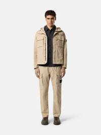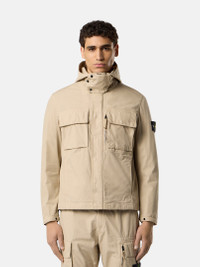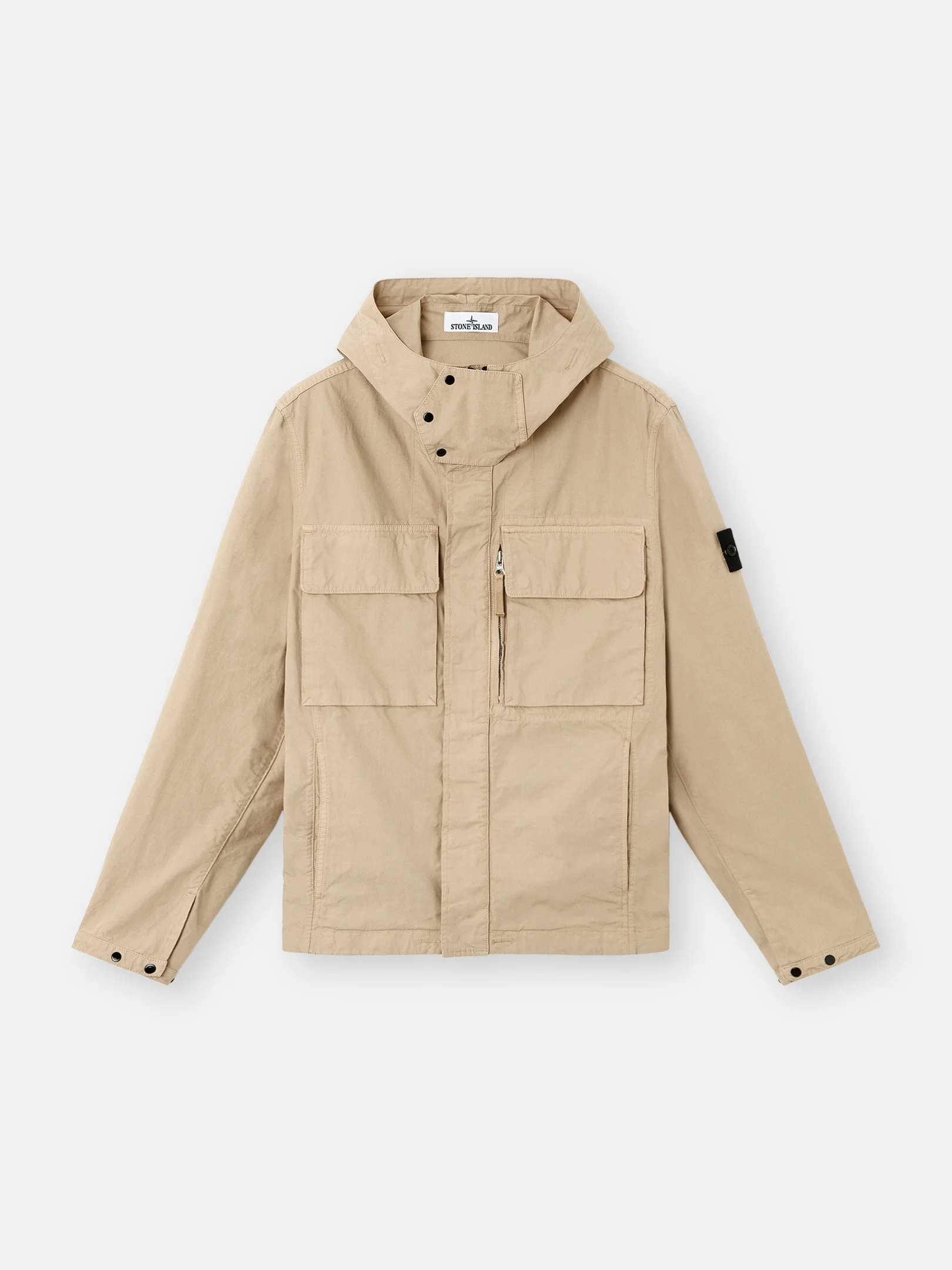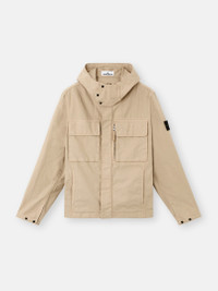 Hooded field jacket in canvas weave cotton, featuring bellows chest pockets, a standing zipper pocket, and hidden two-way zipper fastening. Garment dyed with anti-drop. FABRIC RESEARCH AND TREATMENT Hooded field jacket in canvas weave cotton. The garment dyeing procedure with specific recipes and the addition of an anti-drop agent lends a unique appearance to the piece. STYLE AND FIT Fixed tape drawstring in hood. Triangular chin flap with three snaps. Two chest bellows pockets with three snaps hidden under flap; left pocket overlaps with second standing zipper pocket. Two inner pockets. Standing hand pockets. Eyelets under armholes. Stone Island badge on left sleeve. Tightening snaps at cuffs. Inner fixed tape drawstring in bottom hem. Hidden two-way zipper fastening under snap placket. COMPOSITION AND CARE 100% Cotton