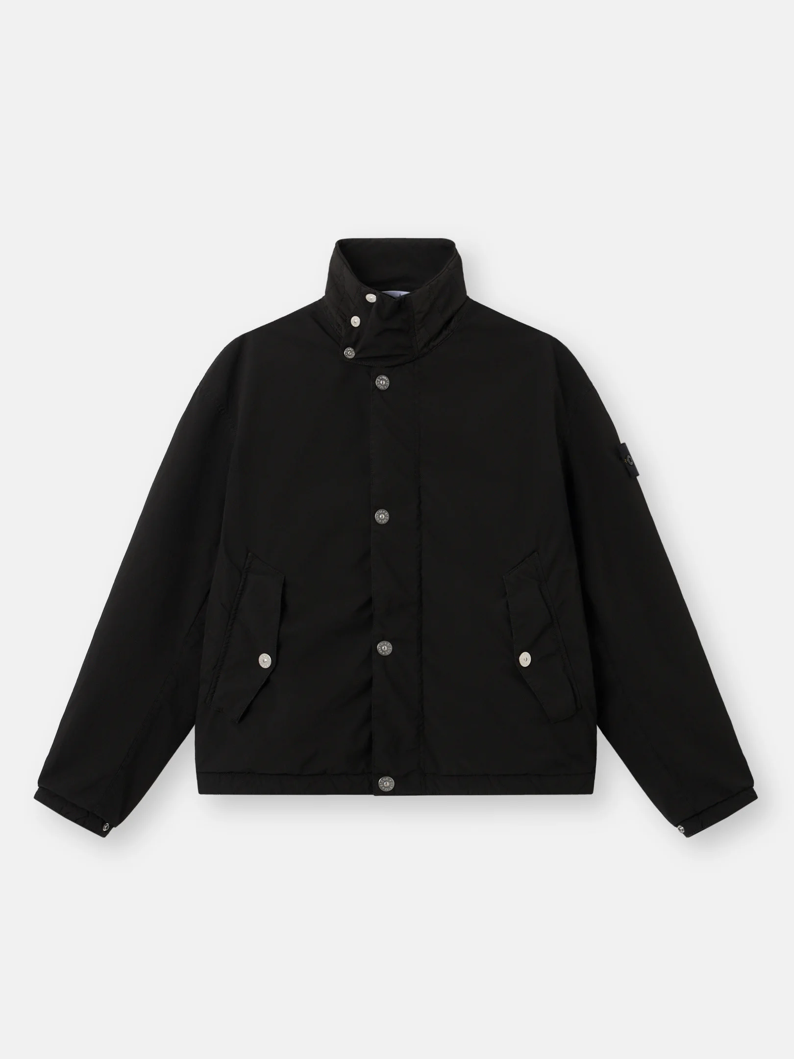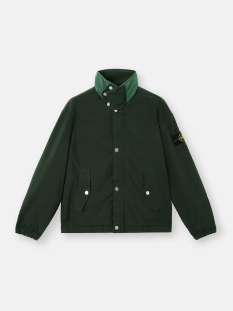 Coach jacket in lightweight polyester canvas with a super matt appearance, featuring a triangular chin flap, snap pockets, and two-way zipper fastening. Garment dyed with anti-drop. FABRIC RESEARCH AND TREATMENT Coach jacket made from a lightweight canvas with 60% recycled polyester, featuring a super matt appearance and a cotton-like hand. The fabric compacts and takes on its final appearance through the garment-dyeing procedure at 130° under pressure. The addition of a special agent to the dye recipe makes the garment anti-drop. STYLE AND FIT Collar can be worn standing and snapped closed with triangular chin flap. Two slanted hand pockets with snap fastening. One inside chest pocket with button. Stone Island badge on left sleeve. Adjustable cuffs with snaps. Ventilation eyelets on sides. Contrasting fabric details. Hidden two-way zipper fastening under double placket with button fastening. COMPOSITION AND CARE Garment: 64% Polyester 36% Elastomultiester / Elasterel-p. Garment Details: 70% Polyester 30% Polyamide / Nylon. Lining: 100% Polyester. Padding: 100% Polyester