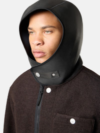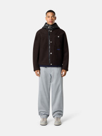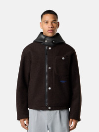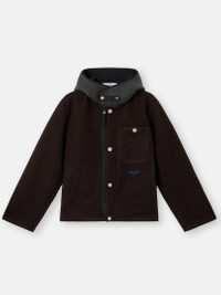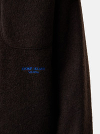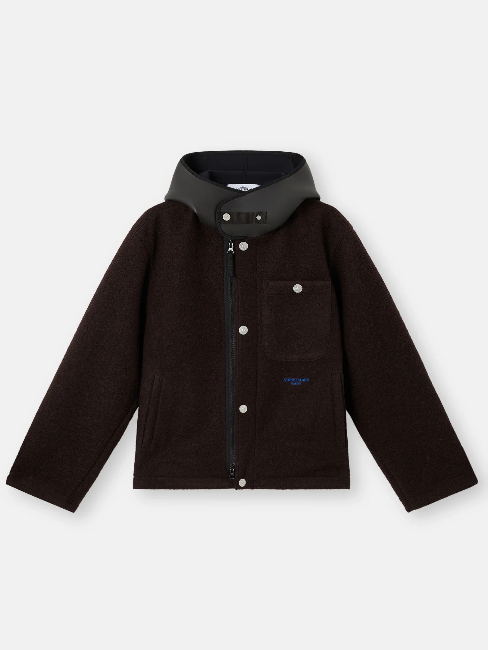 Hooded jacket in felted wool polyester featuring a snap chest pocket above Marina embroidery, adjustable cuffs, and two-way zipper closure. FABRIC RESEARCH AND TREATMENT Hooded jacket in felted wool polyester. STYLE AND FIT Stretch nylon hood with snap-fastened chin strap. On left side, chest pocket with snap above Stone Island Marina lettering embroidery. Slanted hand pockets with hidden snap. Tightening snap at cuffs. Adjustable hook-and-loop straps on bottom sides. Two-way zipper fastening and inner placket with snaps. COMPOSITION AND CARE Outer Layer: 75% Wool 25% Polyester. Membrane: 100% Polyurethanic Resin. Inner Layer: 100% Polyester. Hood: 86% Polyamide / Nylon 14% Elastane / Spandex - Excluding The Coating