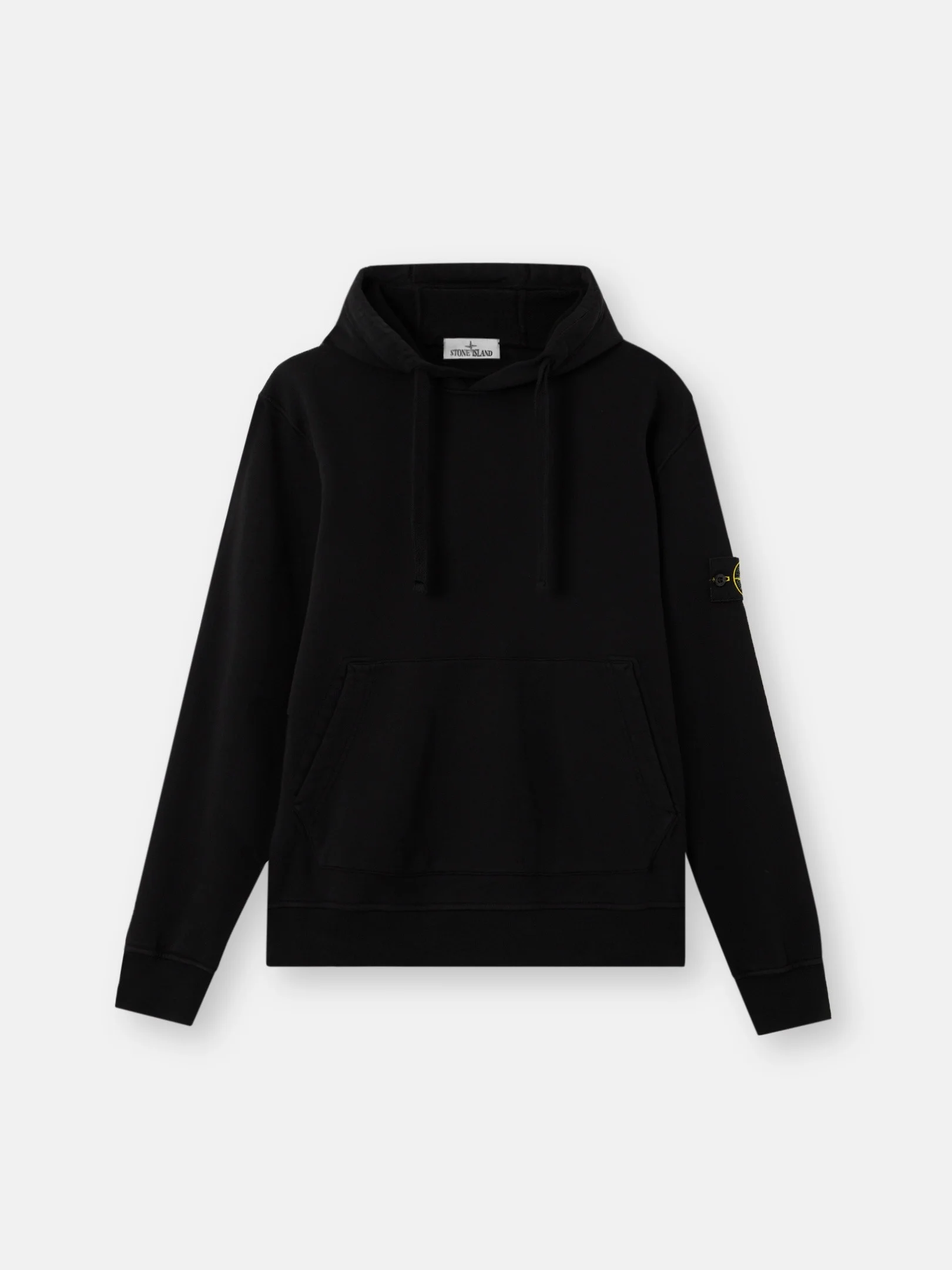 Hooded sweatshirt in organic cotton fleece, featuring a pouch pocket, raglan sleeves on the back, overlock seams, and ribbed trims. Midweight. Garment dyed. FABRIC RESEARCH AND TREATMENT Hooded sweatshirt in organic cotton fleece. Midweight. Garment dyed. STYLE AND FIT Drawstring hood. Pouch pocket with angled openings and internal tape reinforcement. Lunette under back neckline with internal reinforcement. Raglan sleeves on back. Stone Island badge on left sleeve. Ribbed cuffs and bottom band. Overlock stitching at seams. Regular fit. COMPOSITION AND CARE External Fabric: 100% Cotton Ribbing: 98% Cotton 2% Elastane / Spandex
