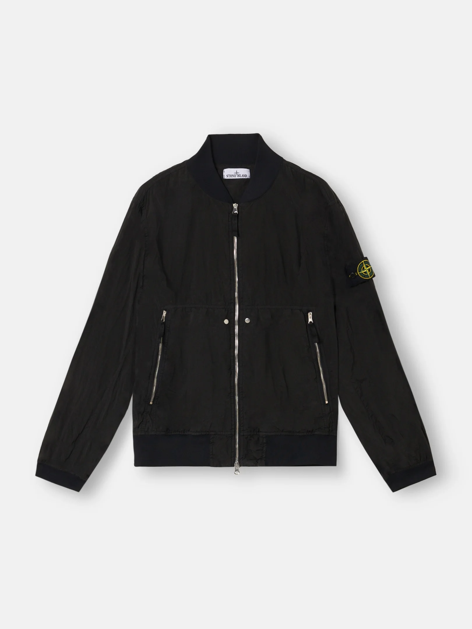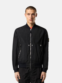 Bomber jacket in Stone Island's iconic Nylon Metal fabric with ECONYL® regenerated yarns with light water and wind resistance. Garment dyed with double-dye procedure and anti-drop. FABRIC RESEARCH AND TREATMENT Bomber jacket made in a new responsible Stone Island iridescent Nylon Metal fabric. The evolution of this iconic fabric sees the use of ECONYL® regenerated yarns: the life-ended nylon, pre- and post-consumer, is recycled with a complex depolymerization process to create this fiber that features the same intrinsic characteristics of nylon from fossil raw material. The fabric is resin treated inside for light water and wind resistance. The finished piece then undergoes an elaborate double-dye procedure with the addition of a special anti-drop agent. STYLE AND FIT Ribbed cuff featuring the Stone Island Compass logo patch. COMPOSITION AND CARE External Fabric: 100% Polyamide / Nylon. Coating: 100% Polyurethanic Resin. Ribbing: 98% Polyamide / Nylon 2% Elastane / Spandex