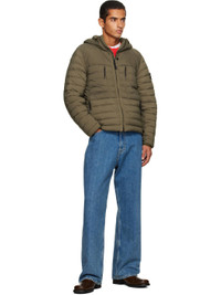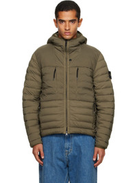 Down-filled and quilted stretch nylon taffeta jacket. · RDS-certified down · Garment-dyed · Elasticized trim at hood and cuffs · Two-way zip closure · Zip pockets at chest and waist · Bungee-style drawstring at hem · Detachable felted logo patch at sleeve · Fully lined Supplier color: Military green Fill: 90% duck down, 10% duck feather. Body: 86% polyamide, 14% elastane. Trim: 87% polyamide, 13% elastane. Lining: 86% polyamide, 14% elastane. Made in Viet Nam 252828M178023