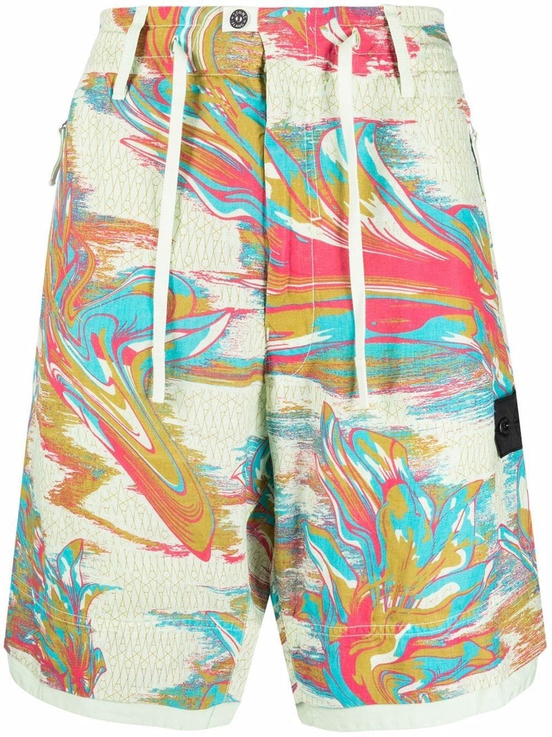STONE ISLAND SHADOW PROJECTMarbled-print bermuda shorts Highlights - light green - linen - marbled pattern - all-over graphic print - signature Compass motif - elasticated drawstring waistband - belt loops - front button fastening - two side zip-fastening pockets - two rear button-fastening pockets - wide leg Made in Italy Composition Linen/Flax 100%, Cotton 100% Washing instructions Machine Wash Designer Style ID: 7619L0227 Wearing The model is 1.85 m wearing size 48 (IT/FR)