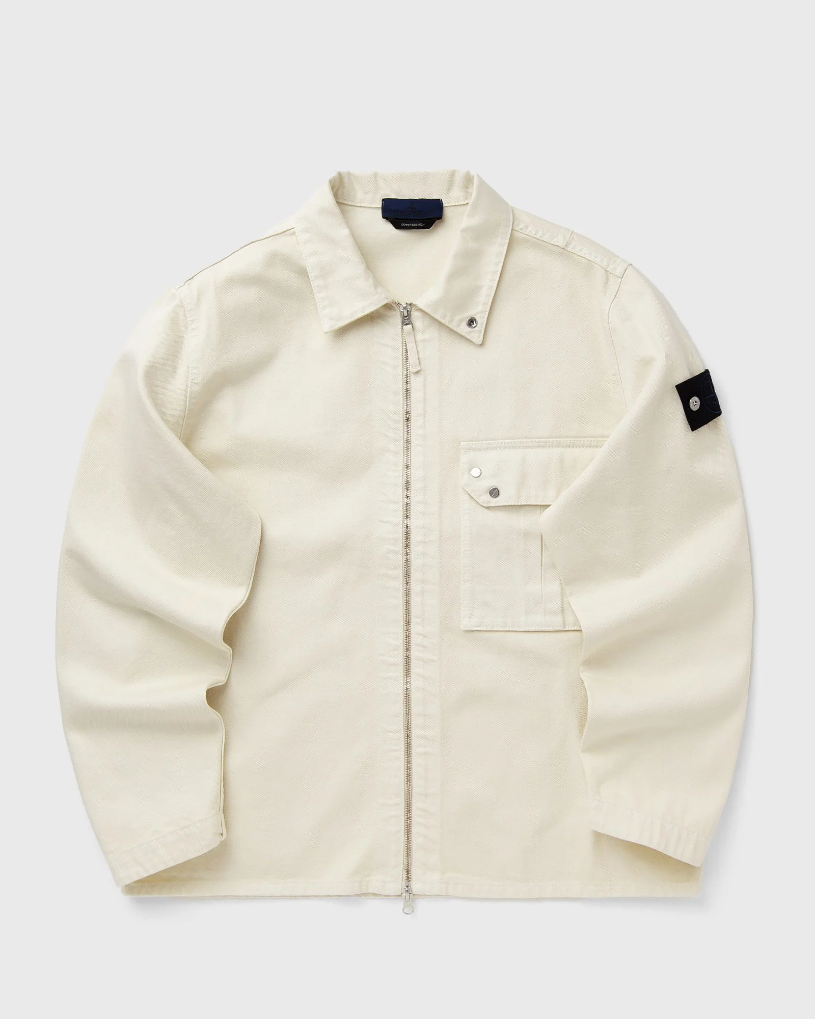 The Stone Island overshirt in a comfortable fit with a zipper is made from lightweight 13 oz denim with a compact twill structure. It features a stand-up collar with a snap button, a practical chest pocket, adjustable cuffs, and a two-way zipper. The piece-dyed fabric gives the overshirt a distinctive, relaxed look, while the iconic Stone Island badge on the sleeve emphasizes its origin and quality. - Collar with snap button for wearing it up - Bellows chest pocket with pleat details and flap with four snap buttons, two of which are concealed - Darts at the back shoulders - Stone Island Denim Research badge on the left sleeve - Adjustable cuffs with snap button - Two-way zipper - Comfort fit Article number: L1S141200002S0J24.V0093 Gender: men Color: IVORY Material: 100% Cotton