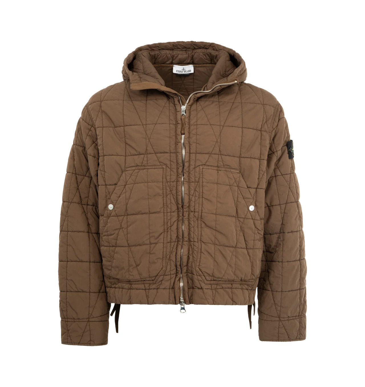 STONE ISLAND Quilted Short Parka featuring padded hood, angled patch hand pockets with snap closure, Stone Island badge at the left sleeve, adjustable cuffs with snap, side tape adjusters at hem and two-way zip fastening. Organic cotton and recycled nylon. DESIGNER STYLE ID: 4100014-S0300 COLOR: V007C UMBER